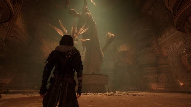 Vuelve a dirigirte hacia el oeste desde la bandera y pasa de largo el patio con Bailarinas hasta llegar a un balcón en el que puedes recoger un Catalizador de croma resplandeciente. Un poco más abajo tienes otra plataforma tipo ascensor. Úsala para llegar a la siguiente ubicación, una especie de Coliseo en la que hay un gestral herido en el suelo y una enorme estatua en el centro.