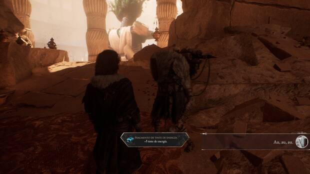 Aquí, delante de la bandera, hay una criatura muy grande tapando un camino. Es un jefe, pero de momento vamos a evitarlo. Desde la bandera baja las escaleras y ve pegado hacia la derecha, al oeste, para recoger un Fragmento de tinte de energía.