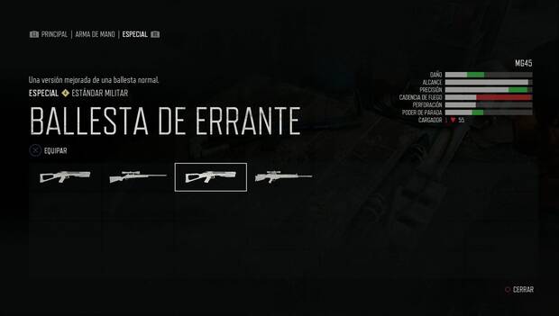 - Un fantástico fusil de francotirador. El daño no es superior al de la ballesta, pero obviamente ofrece prestaciones como una mira telescópica y un alto nivel de penetración, sacrificando el sigilo que ofrecen las flechas. Pero puedes ponerle un silenciador.