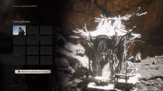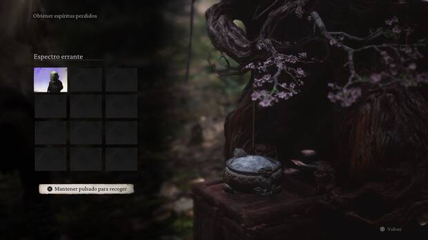 Igualmente, nos queda por añadir un apunte importante. Si tras derrotar a un jefe se te olvida recoger su espíritu, todavía puedes conseguirlo desde cualquier Altar del Custodio. Los espíritus que no hayas recogido aparecen en el altar, en el menú "Obtener espíritus" (como ves en la imagen superior). Ahí podrás ver los espíritus/almas que te hayas perdido y reclamarlos para tu inventario.