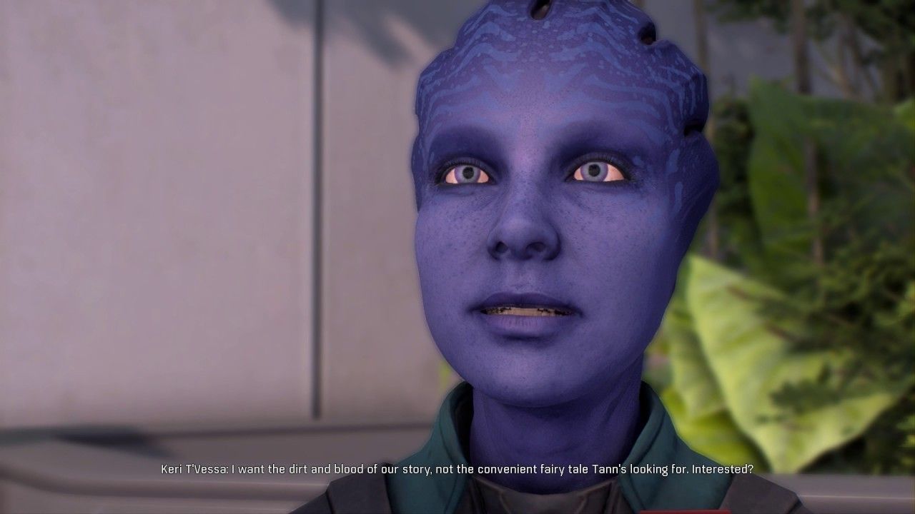 Keri es una periodista Asari con la que puedes empezar a hablar tras establecer la primera colonia en Eos. Puedes flirtear con ella mientras te entrevista, y tras hacerlo varias veces hablará contigo directamente, diciéndote que le gustas pero que tiene un conflicto de interés.