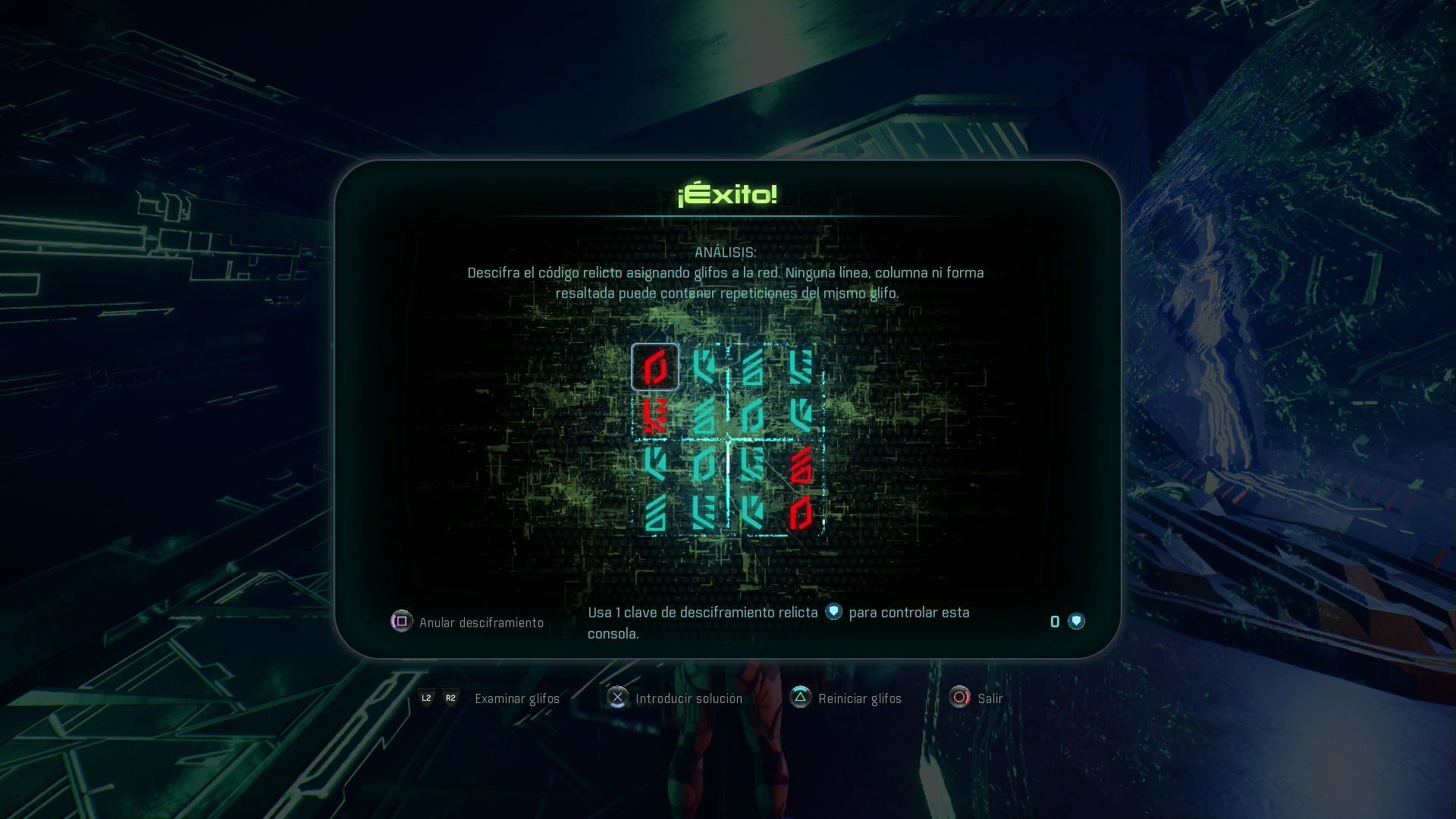 Una vez abierta la puerta llegarás a un pasillo en el que tendrás que matar a todos los enemigos para poder examinar la terminal en la que debes solucionar otro Rompecabezas relicto.