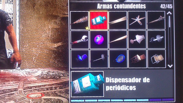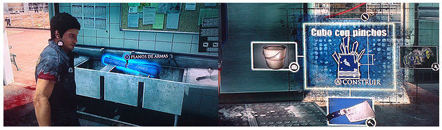Un cubo con objetos punzantes incrustados, el golpe con X es bastante efectivo, con Y se lo ponemos a los zombis triturándoles la cabeza.