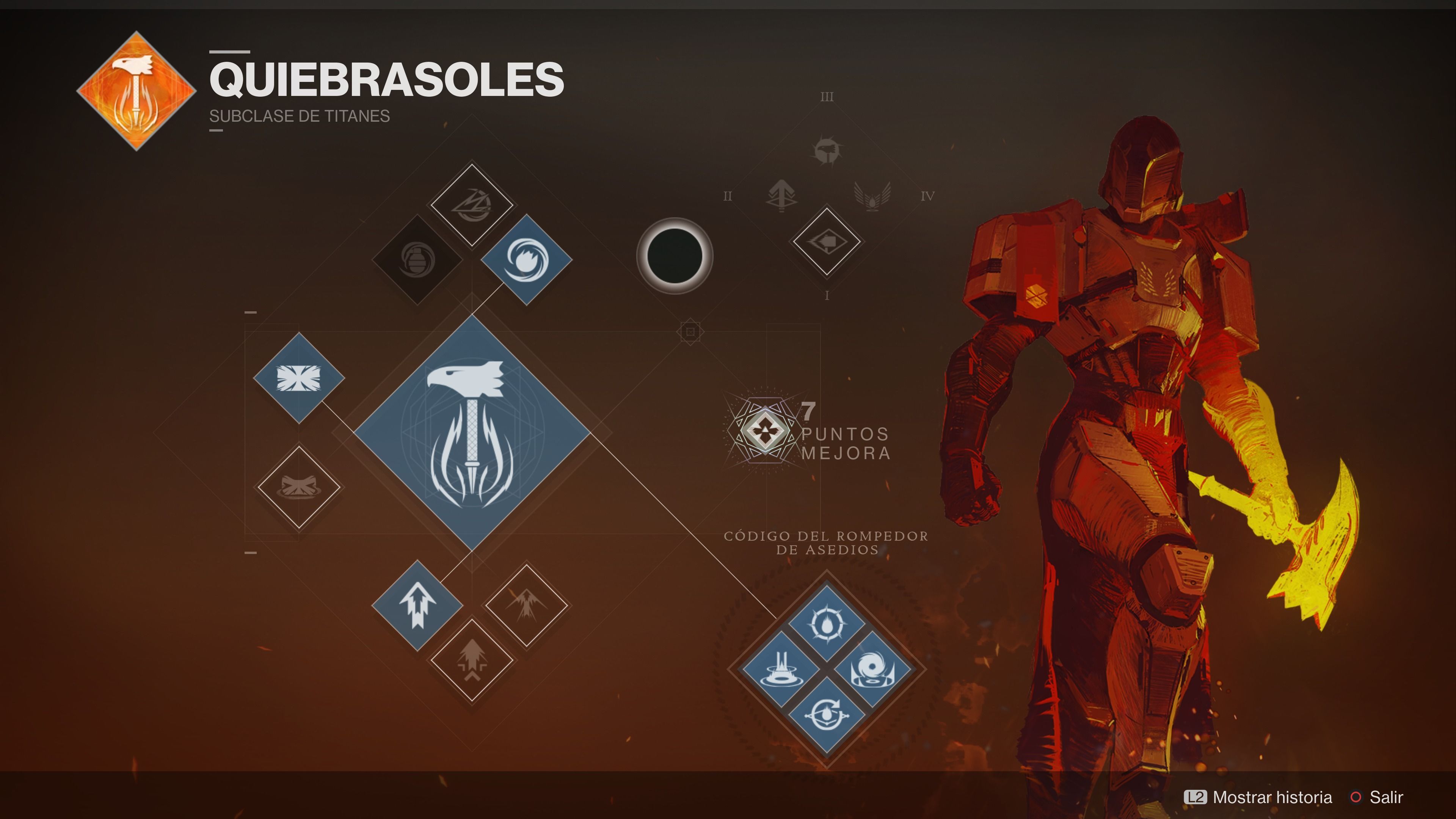 Cada subclase tiene una serie de habilidades que tenemos que ir desbloqueando con puntos de mejora, que se obtienen cada vez que subimos de nivel. Estas son todas las mejoras que podemos desbloquear para la subclase Quiebrasoles.