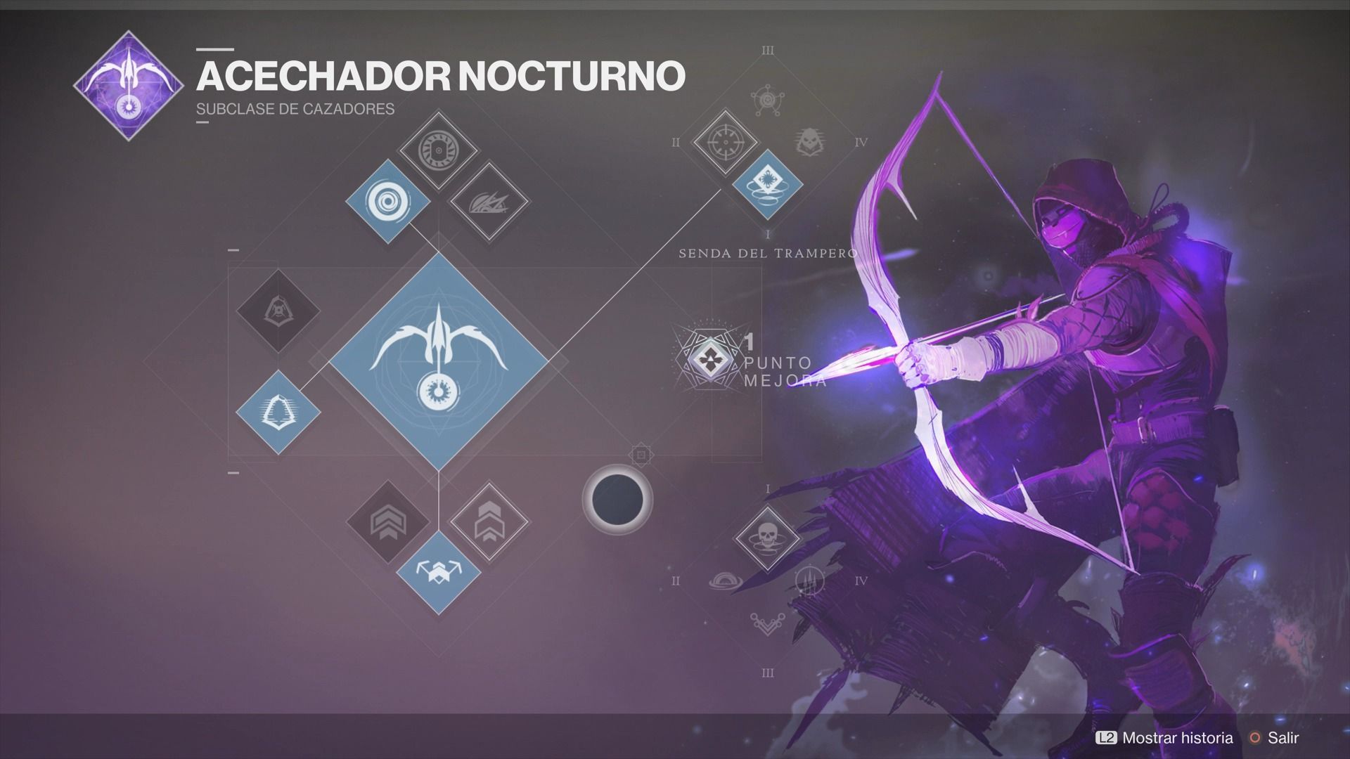 Cada subclase tiene una serie de habilidades que tenemos que ir desbloqueando con puntos de mejora, que se obtienen cada vez que subimos de nivel. Estas son todas las mejoras que podemos desbloquear para la subclase Acechador nocturno.