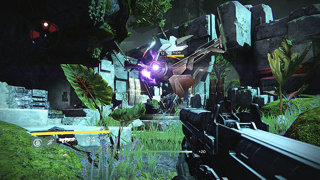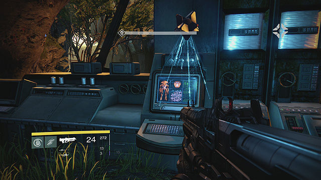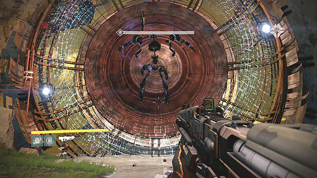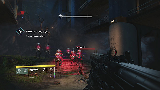 -Resiste a los Vex. Justo al analizarla vienen nuevos enemigos, máquinas conocidas como Vex, vienen varias oleadas y hay que resistirlas. Tienen su punto débil en la tripa, si no les matamos bien se mueven rotos y son más peligrosos, cuidado con los Hobgoblins, Vex que disparan un rayo bastante dañino, también aparece un Minotauro equivalente a los Capitanes/Caballeros, pero más peligroso, intentar que no se regenere el escudo. Bien la zona tiene 2 terrazas elevadas sobre el pasillo que aparecen los Vex, puede venirnos bien, además cuando van a aparecer sale una luz morada sobre el sitio, una granada, un disparo certero de Arma Pesada o uso de Súper nos quitaremos a varios de encima. Una vez acabemos con todos tenemos un encontronazo con la desconocida.