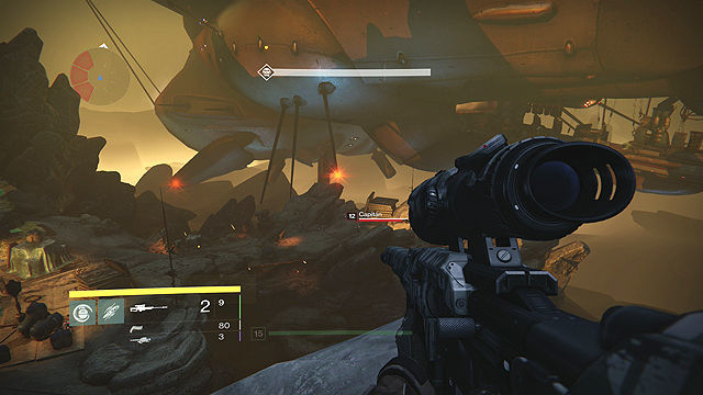 Localiza la fuente de intenso patrón Vex en los riscos de Ishtar y acaba con él. Recorremos la costa por donde estaba el sirviente en la misión anterior y vamos hacia los Riscos de Ishtar, una vez lleguemos la zona esta llena de enemigos Caídos y Vex, avanzamos hacia el punto eliminando a los enemigos.