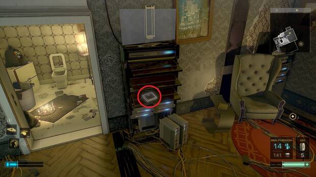 Cuando hayas acabado de revisar este apartamento, desplázate al 95. Espera a que el hombre vaya al baño y acaba con la mujer absorbida por la estática de un tiro a la cabeza. Después ve a por él. En el dormitorio, tras una pintura, darás con una caja abierta desbloqueada. Ábrela para encontrar otro Software Breach.