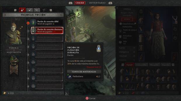 Al principio tu poción de curación será la más débil, pero en cuanto llegues al nivel 10 de personaje vas a poder adquirir la primera mejora de pociones, la de la "Poción de curación diminuta" (que requiere 2 patibulianas). Esta mejora aumenta la cantidad de vida que recuperas al instante (el porcentaje de vida máxima que recuperas durante unos segundos se mantiene siempre igual; es decir, 35% de tu vida máxima en 3 s).