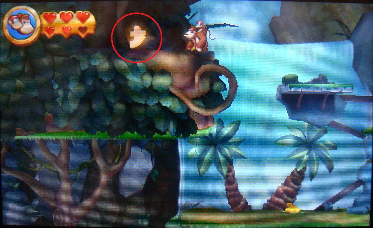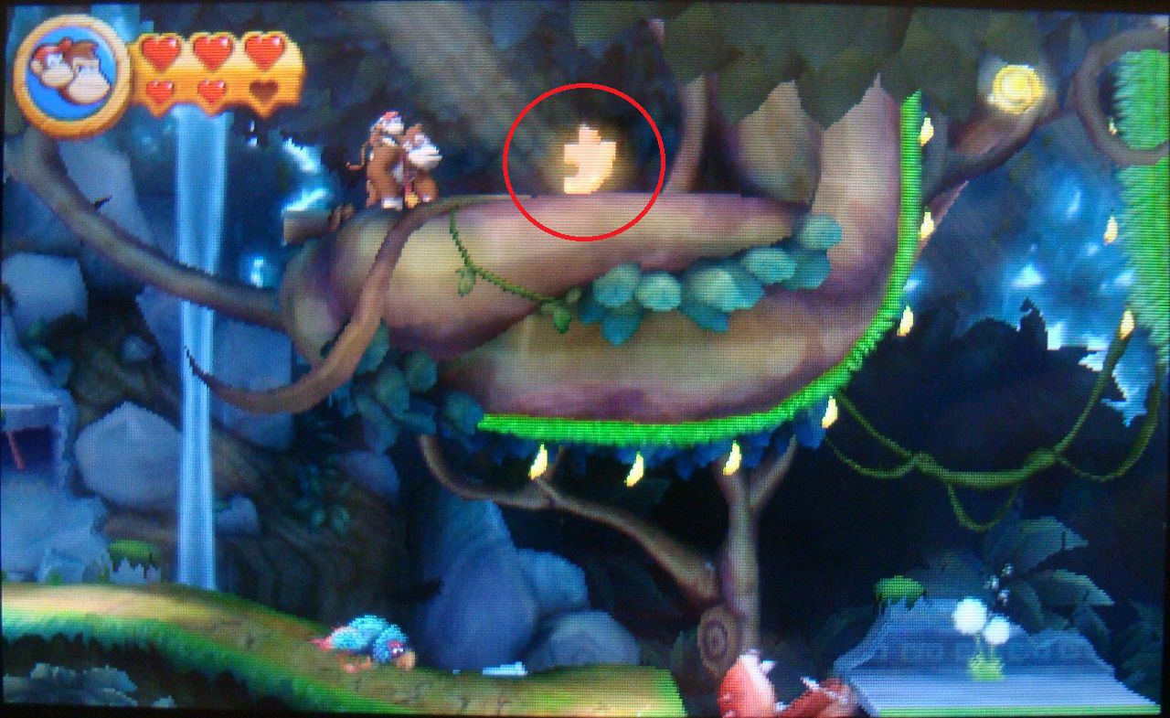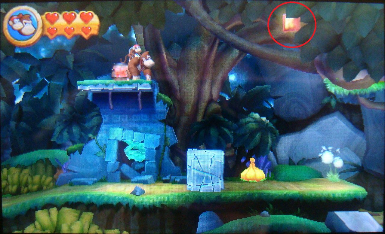 Asciende esta misma plataforma bajo la que estaba la letra cogiéndote a la hierba. Arriba encontrarás un barril. Entrando en él accederás a una zona de bonus: coge todas las monedas y plátanos para obtener la cuarta pieza de puzle.
