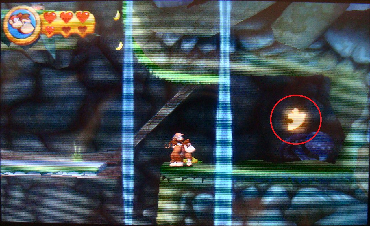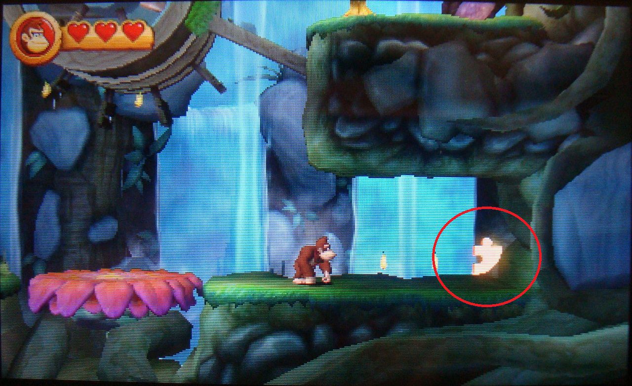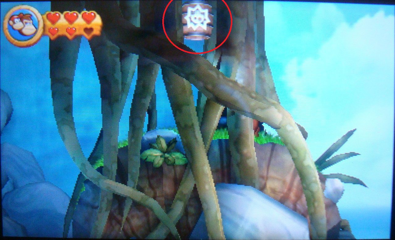 Nada más comenzar el nivel aprenderás a desplazarte por techos con hierba: mantén pulsado R o L para sujetarte y suéltalo cuando quieras caer. Prueba con el primero para pasar al otro lado de los pinchos. Sube sobre la plataforma que tiene un barril y salta hacia la derecha para obtener la letra K.