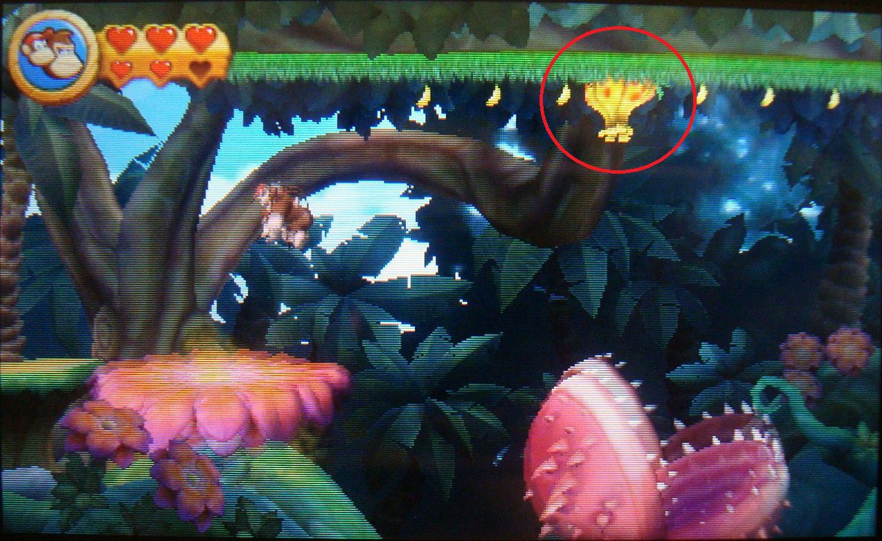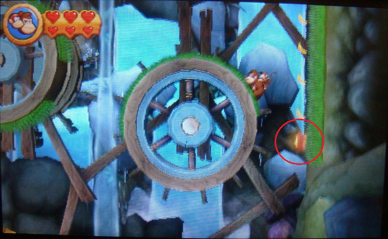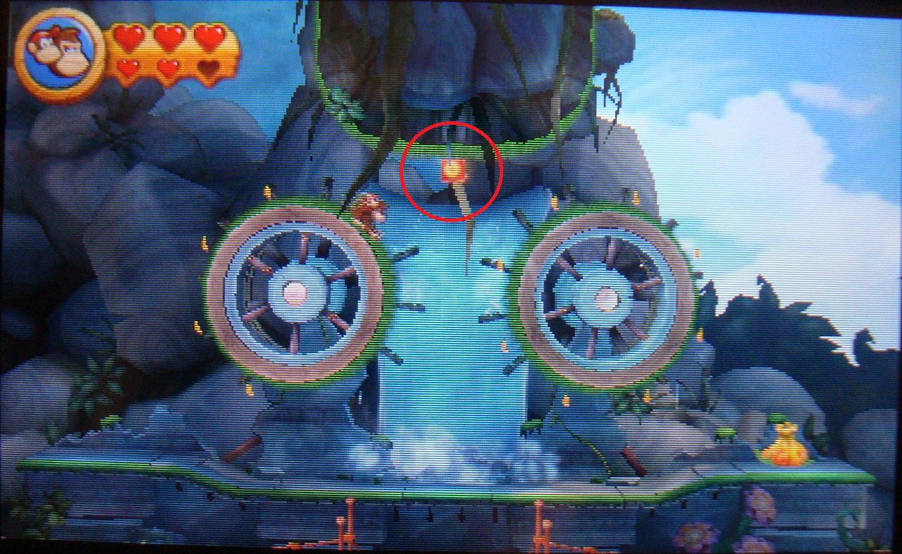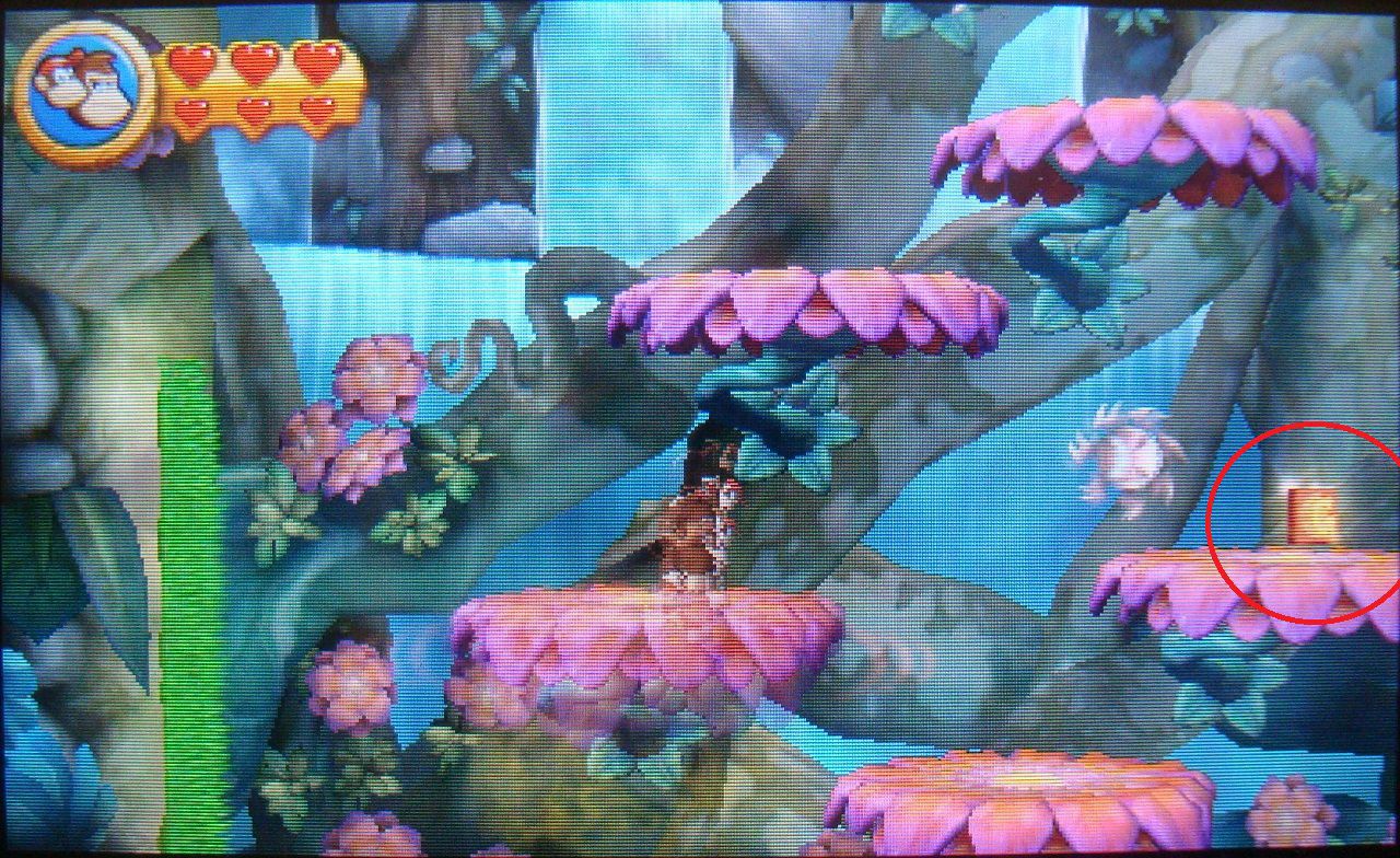 Avanza por la derecha, con cuidado de que las plantas carnívoras no te toquen. Tras cruzar un puente de madera, golpea frente a la planta amarilla para que aparezca un barril encima. Métete en él y sal disparado para llegar al escenario de atrás. Cógete a una rueda para llegar a la letra O que hay en lo alto.