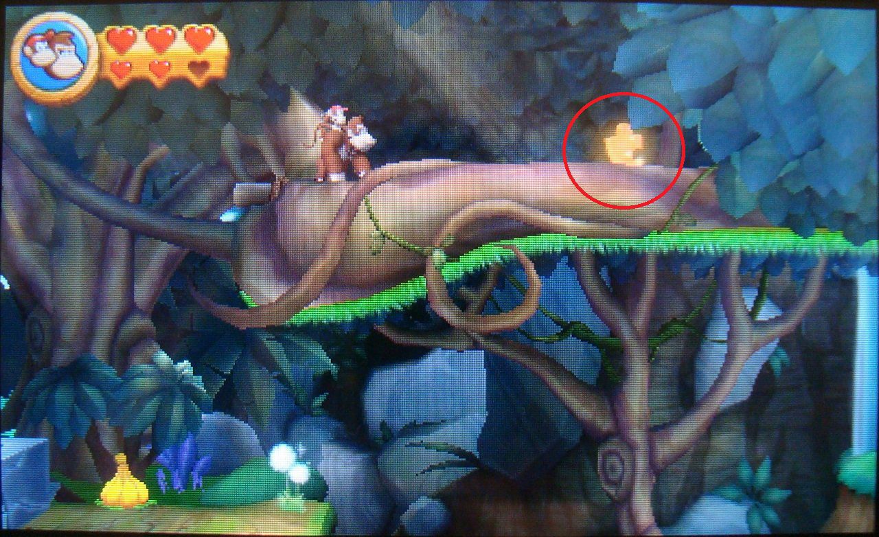 Golpea la flor amarilla cuando quieras volver al primer plano del escenario. Avanza por la derecha y, en el primer techo con hierba que te cojas, golpea la flor amarilla para recoger la quinta pieza de puzle.