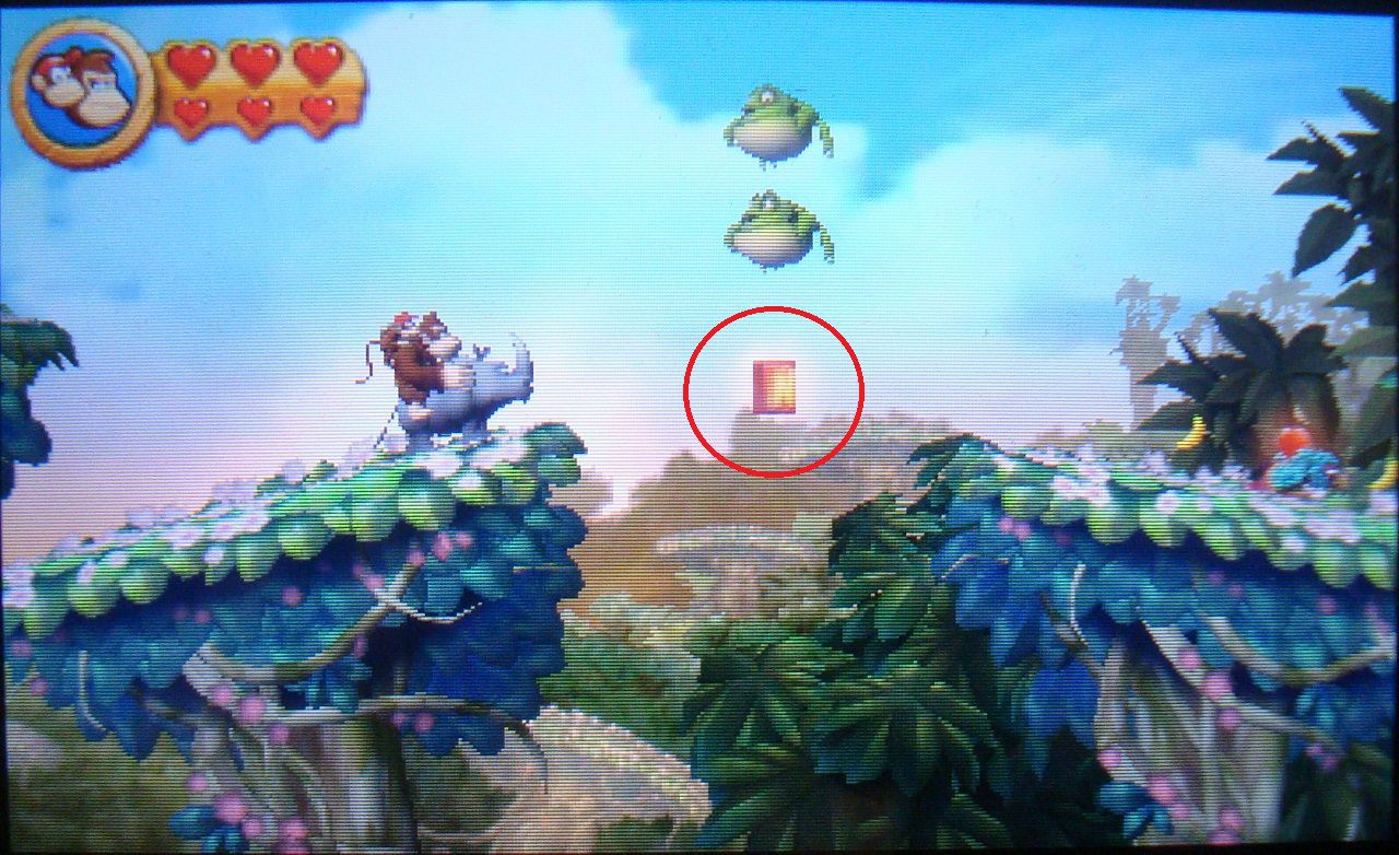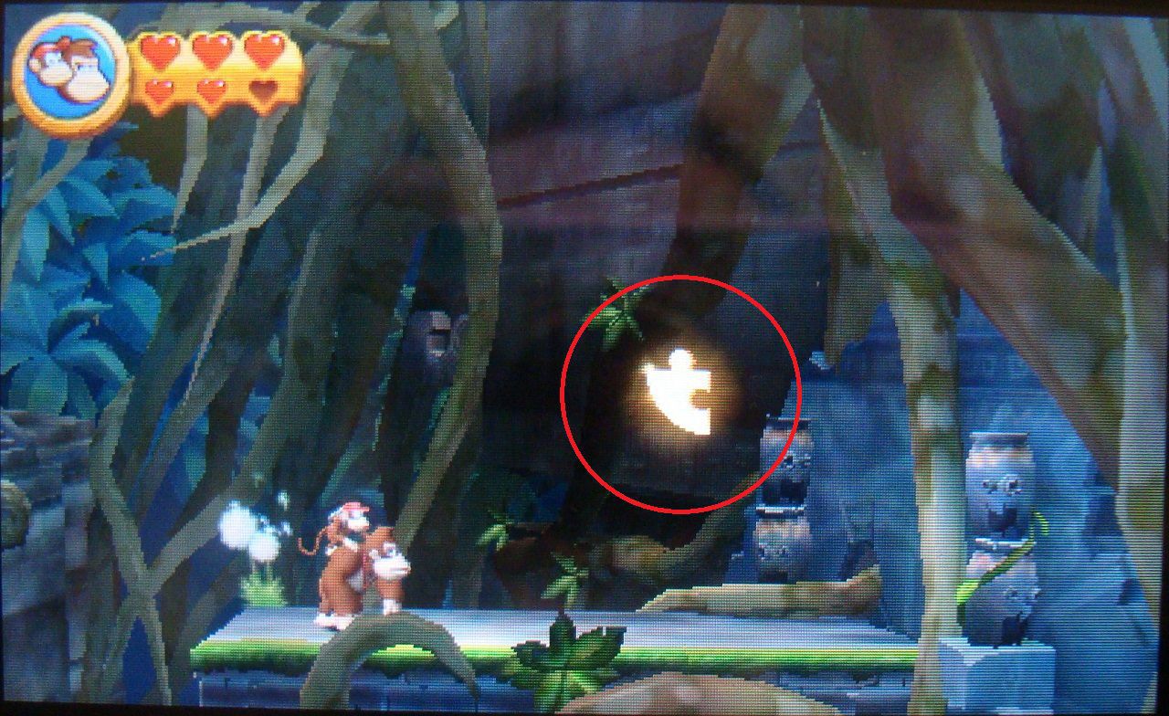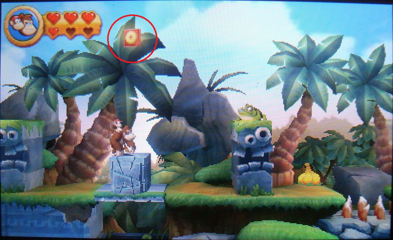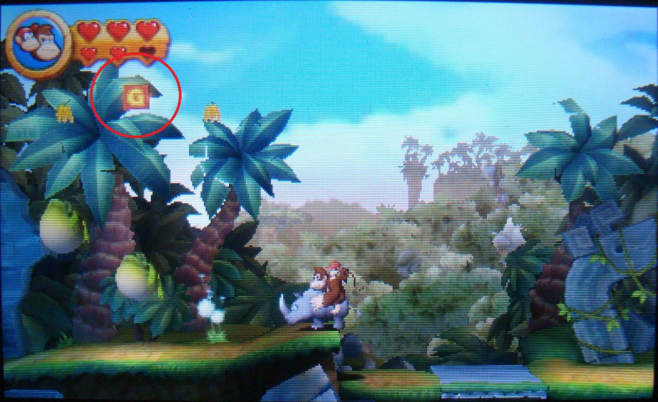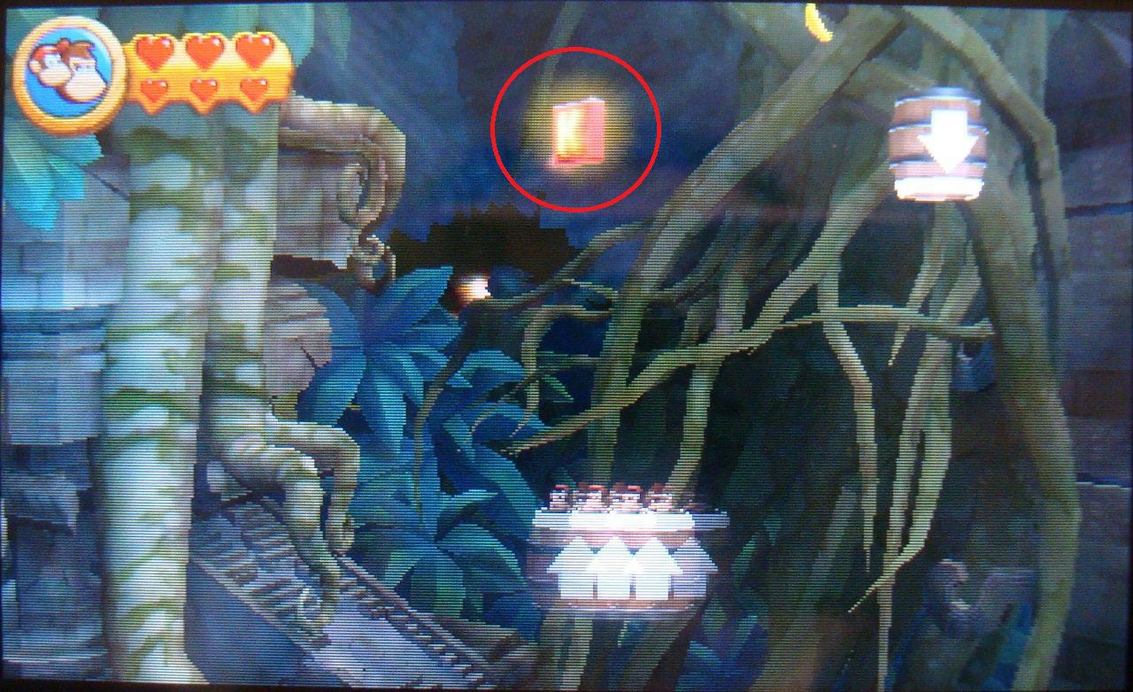 Avanza todo el recorrido hasta llegar a un par de barriles, uno DK y otro con flecha. Antes de meterte en el segundo, lánzate hacia el precipio de la derecha. Alcanzarás una plataforma con la primera pieza de puzle.