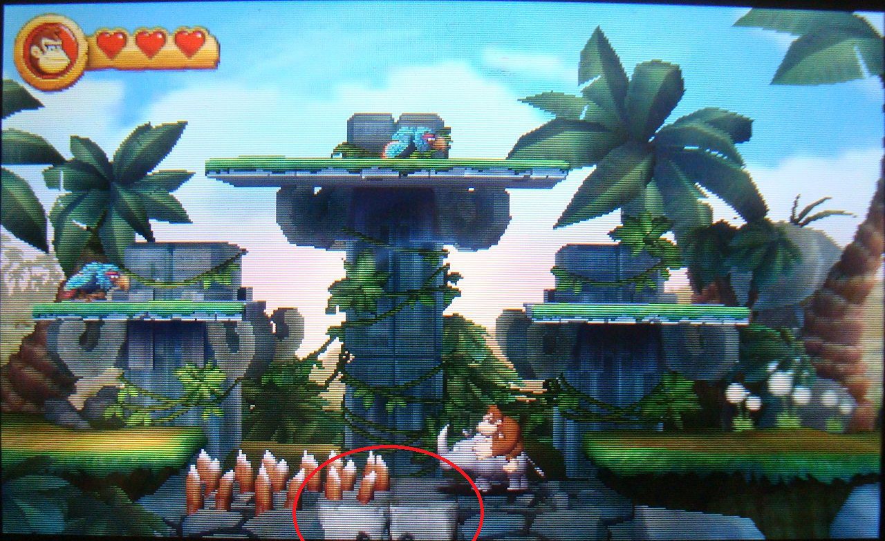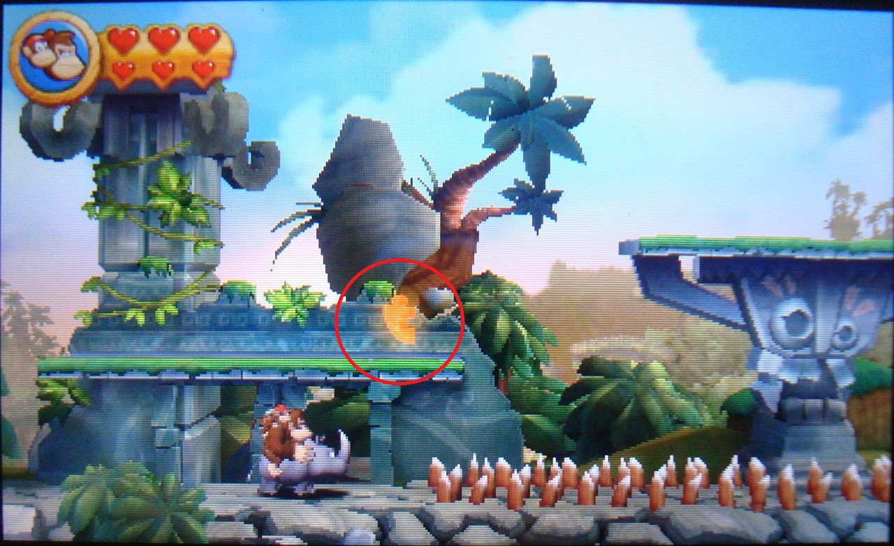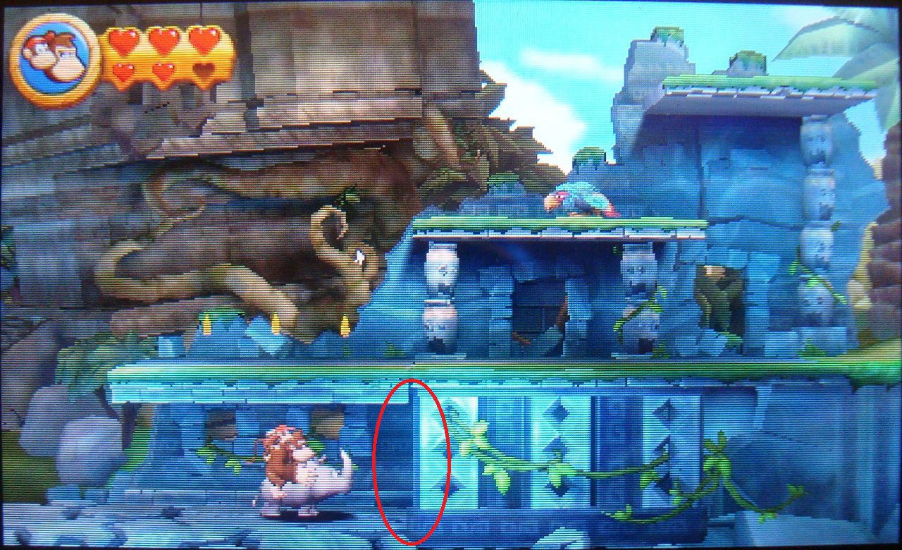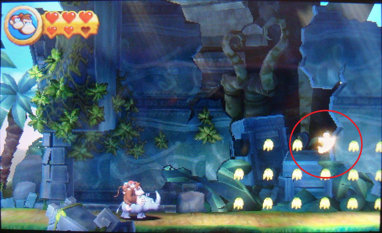 Pasado el punto de control, golpea la primera plataforma de piedra que encuentres. Caerás sobre una caja de madera con la cara del rinoceronte Rambi. Golpéala y subirás a su espalda. Vuelve a la superfície y ve hacia la izquierda, hasta los pinchos que había bajo las tres plataformas flotantes. Rómpelos y luego destruye la piedra central con el botón Y. Accederás a una fase bonus, cuyo premio es la segunda pieza de puzle.