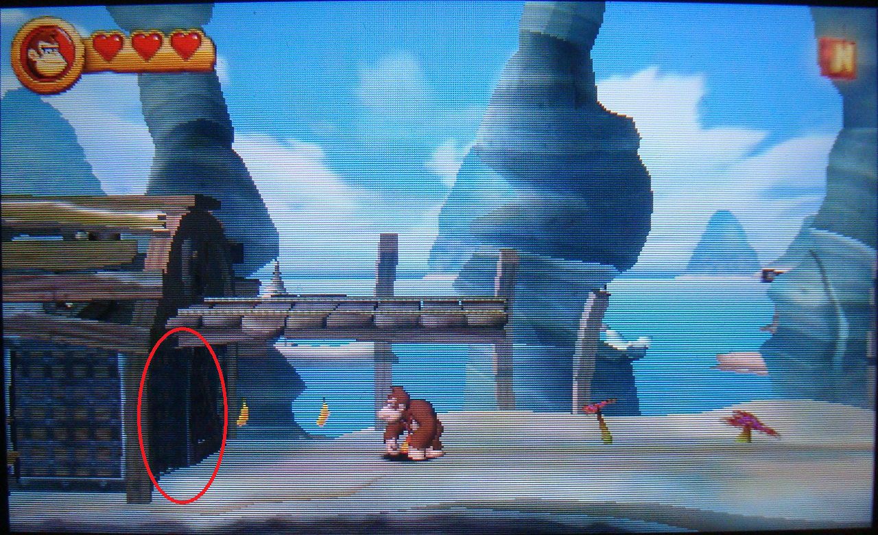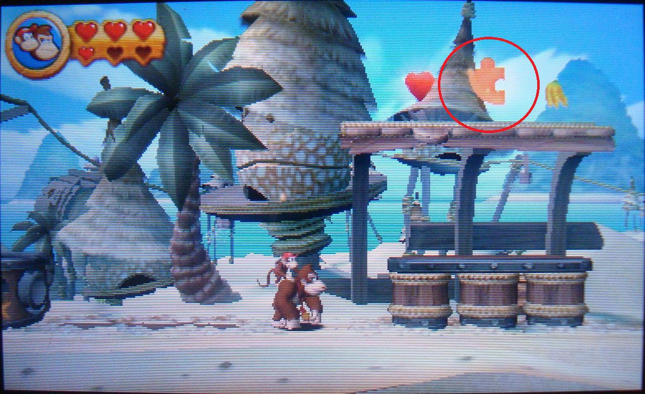 Al empezar el nivel, ve hacia la derecha, golpea el doble tocón y sube sobre el que acaba de aparecer para llegar a un barril DK. Cógelo con L o R y mantén pulsado el botón mientras lo llevas hacia el extremo izquierdo, donde lo usarás para romper las maderas que protegen la primera pieza de puzle.