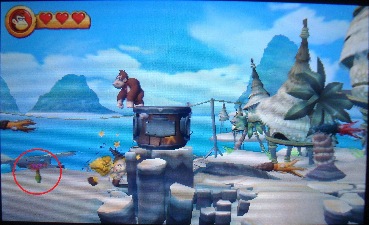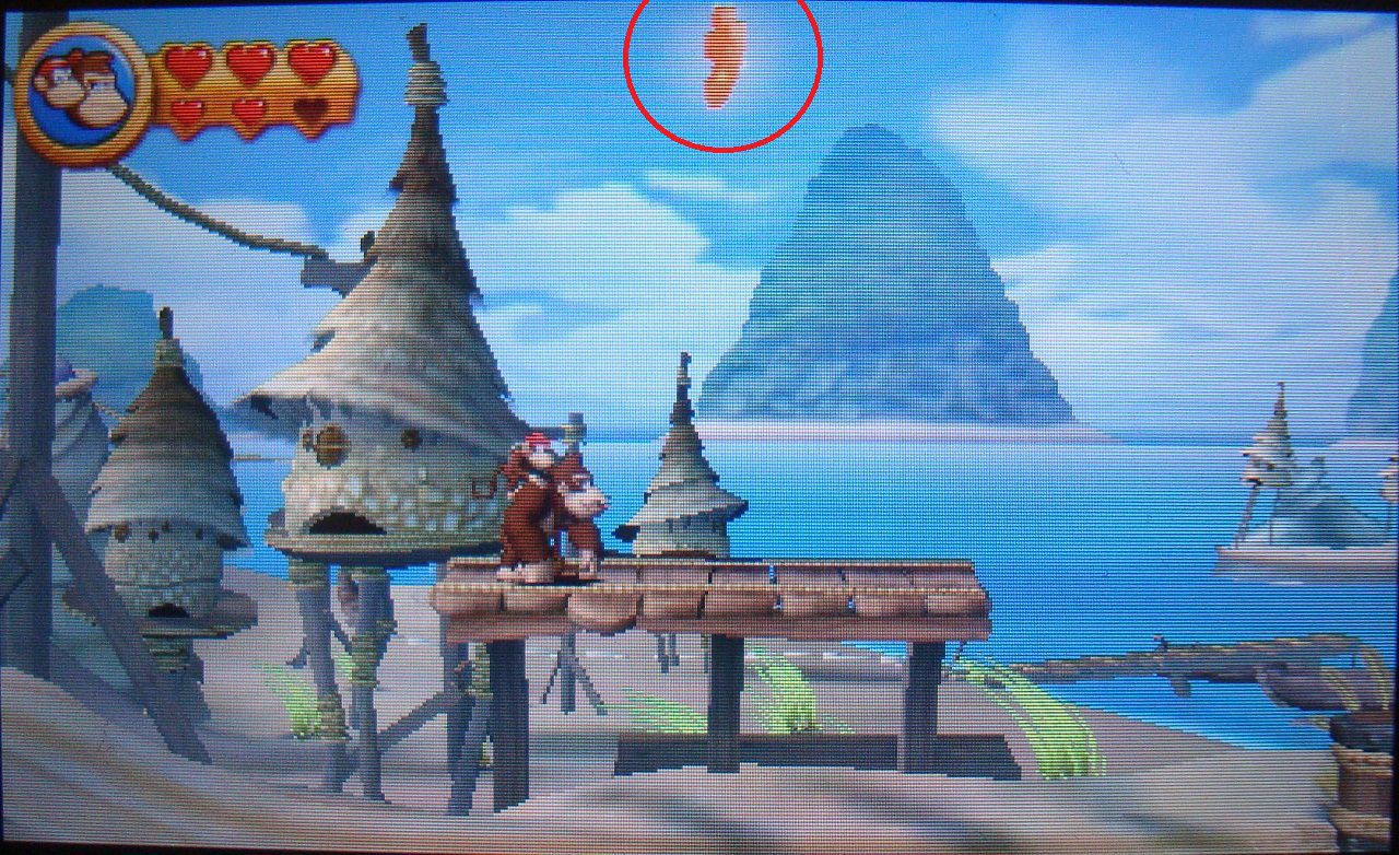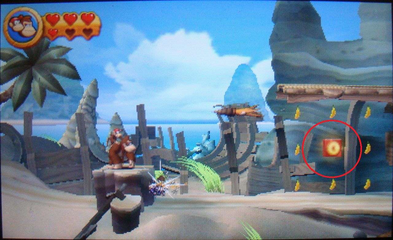 Justo debajo de la plataforma de donde vienen esos calamares hay una ristra de plátanos. Rueda al cogerlos para entrar en una fase bonus. Recoge todos los ítems y obtendrás la sexta pieza de puzle.