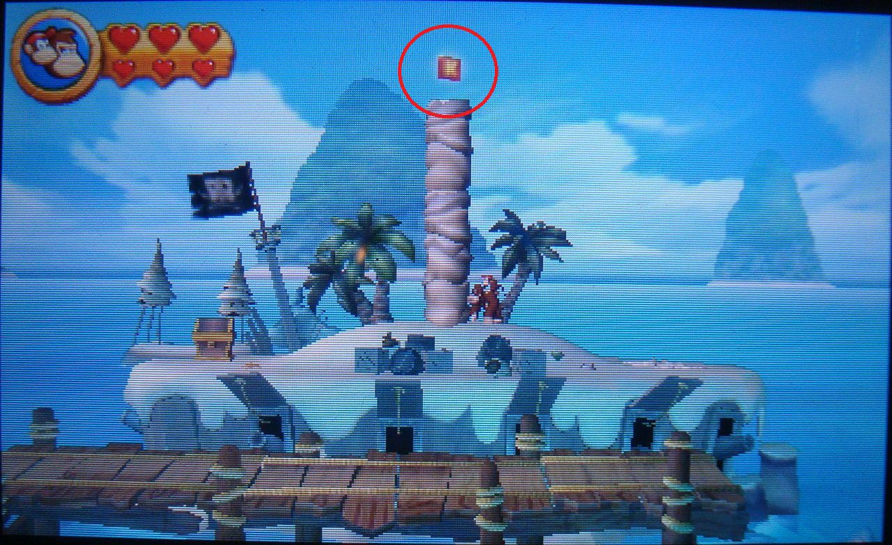 Golpea el triple tocón para abrirte camino y sigue adelante. Pasa el cerdo del punto de control y ve hasta el final de las pasarelas. Ahí verás dos cajas, rómpelas. Aparecerá un cofre, que al abrirlo desvelará un barril. Métete en él para ir a la parte trasera del escenario y rueda contra el pilar para derribarlo. Recoge la letra K y abre el siguiente cofre para regresar al primer plano.