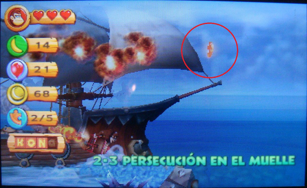 Tras la última secuencia de cañonazos, una mirilla gigante se posará sobre ti. Sitúate en el extremo más elevado y, cuando veas que está a punto de disparar, déjate caer rápidamente. El barco explotará y tú podrás seguir tu camino, recogiendo de paso la letra G.