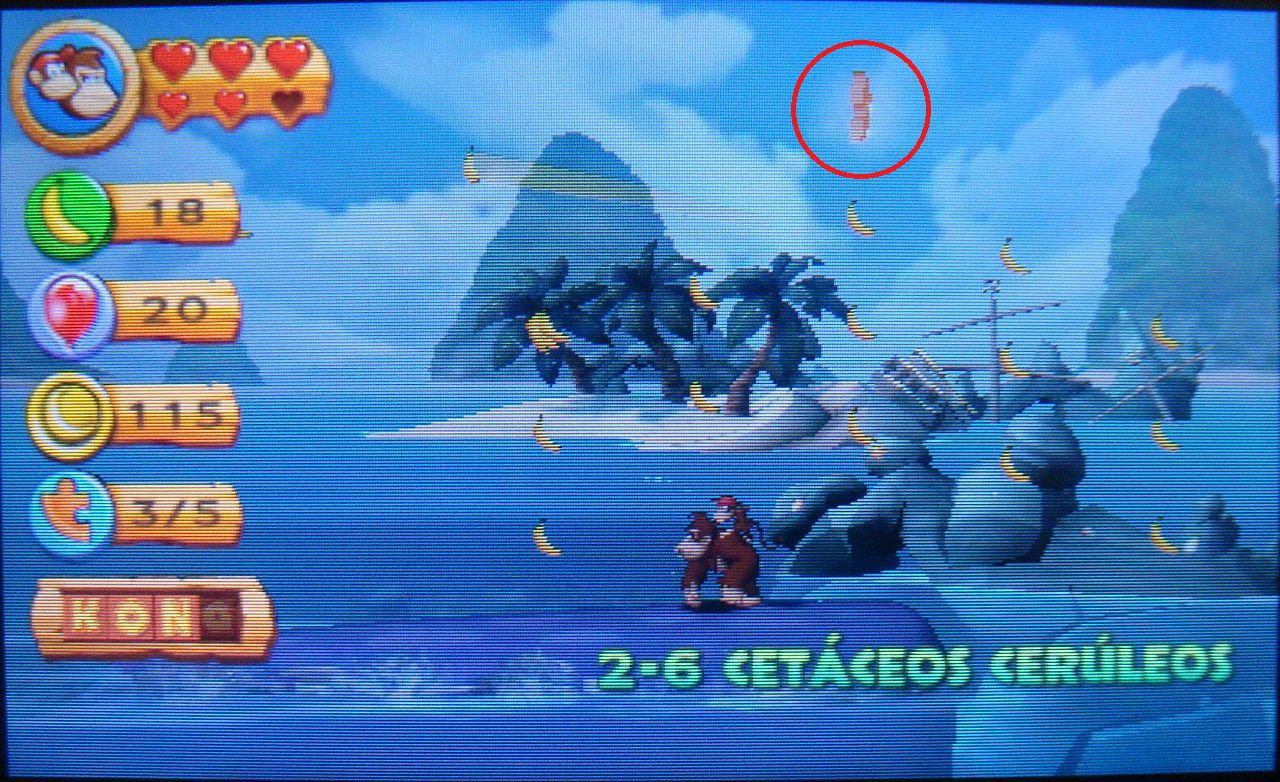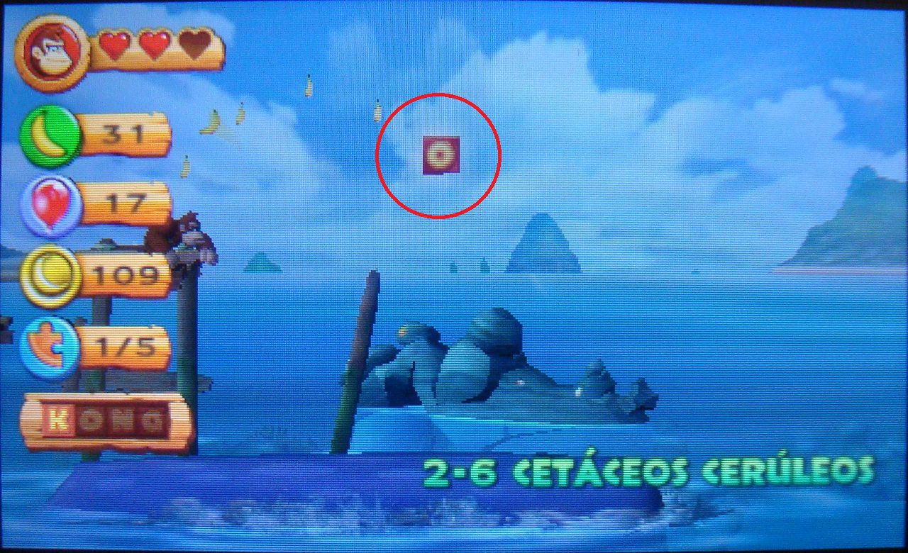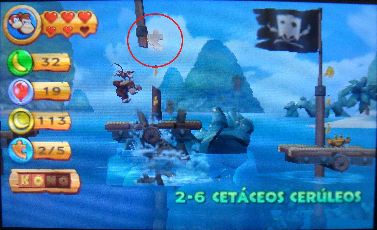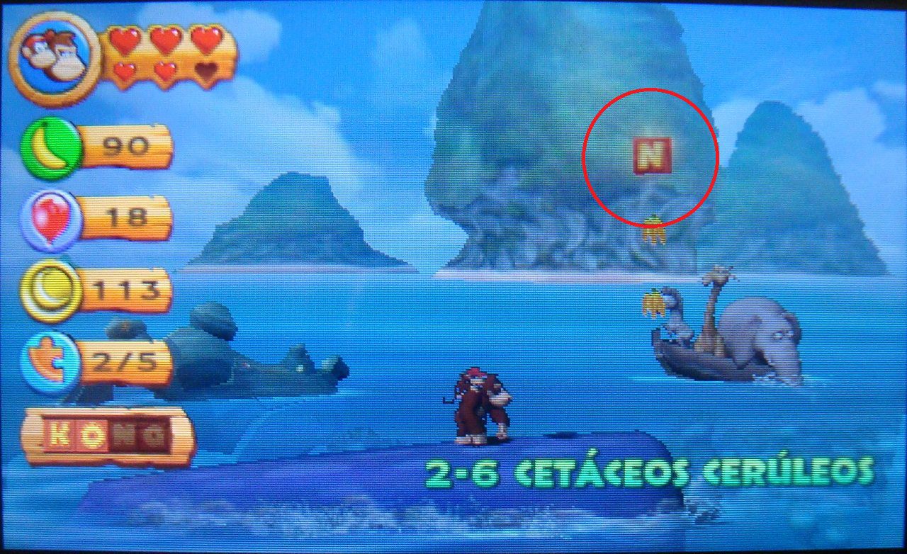 Cuando la ballena se sumerja, usa los barriles para llegar hasta las plataformas. Tendrás que avanzar al mismo ritmo que la ballena si no quieres acabar en el agua. Al volver a su espalda, verás aparecer la letra N. Golpea el surtidor de la ballena para elevarte hasta ella.