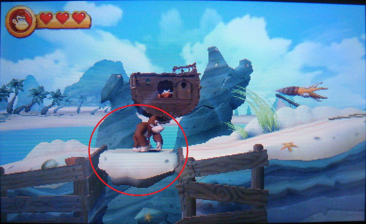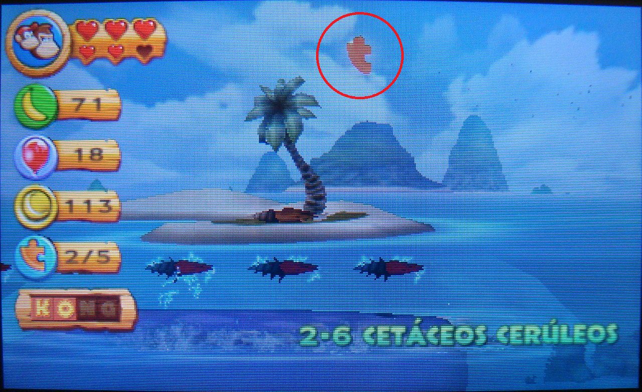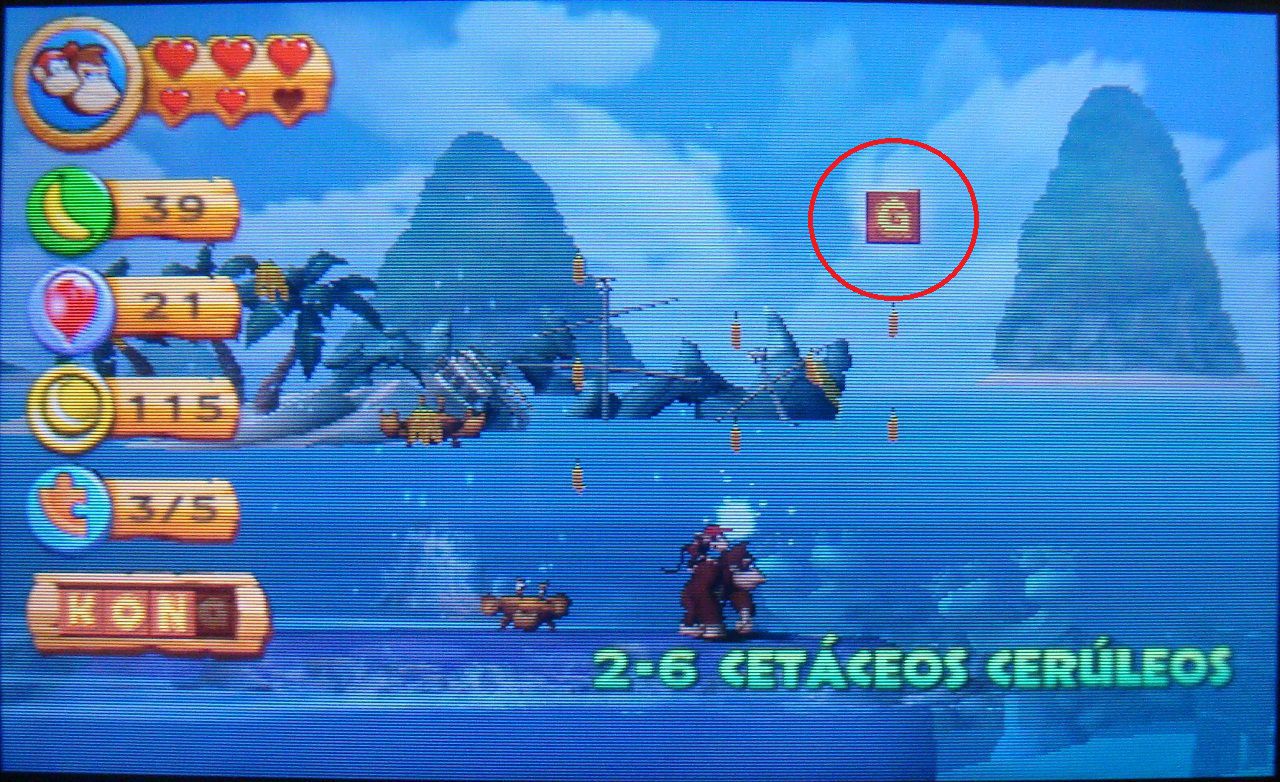 Cuando la ballena se sumerja, usa los barriles para llegar hasta las plataformas. Tendrás que avanzar al mismo ritmo que la ballena si no quieres acabar en el agua. Al volver a su espalda, verás aparecer la letra N. Golpea el surtidor de la ballena para elevarte hasta ella.