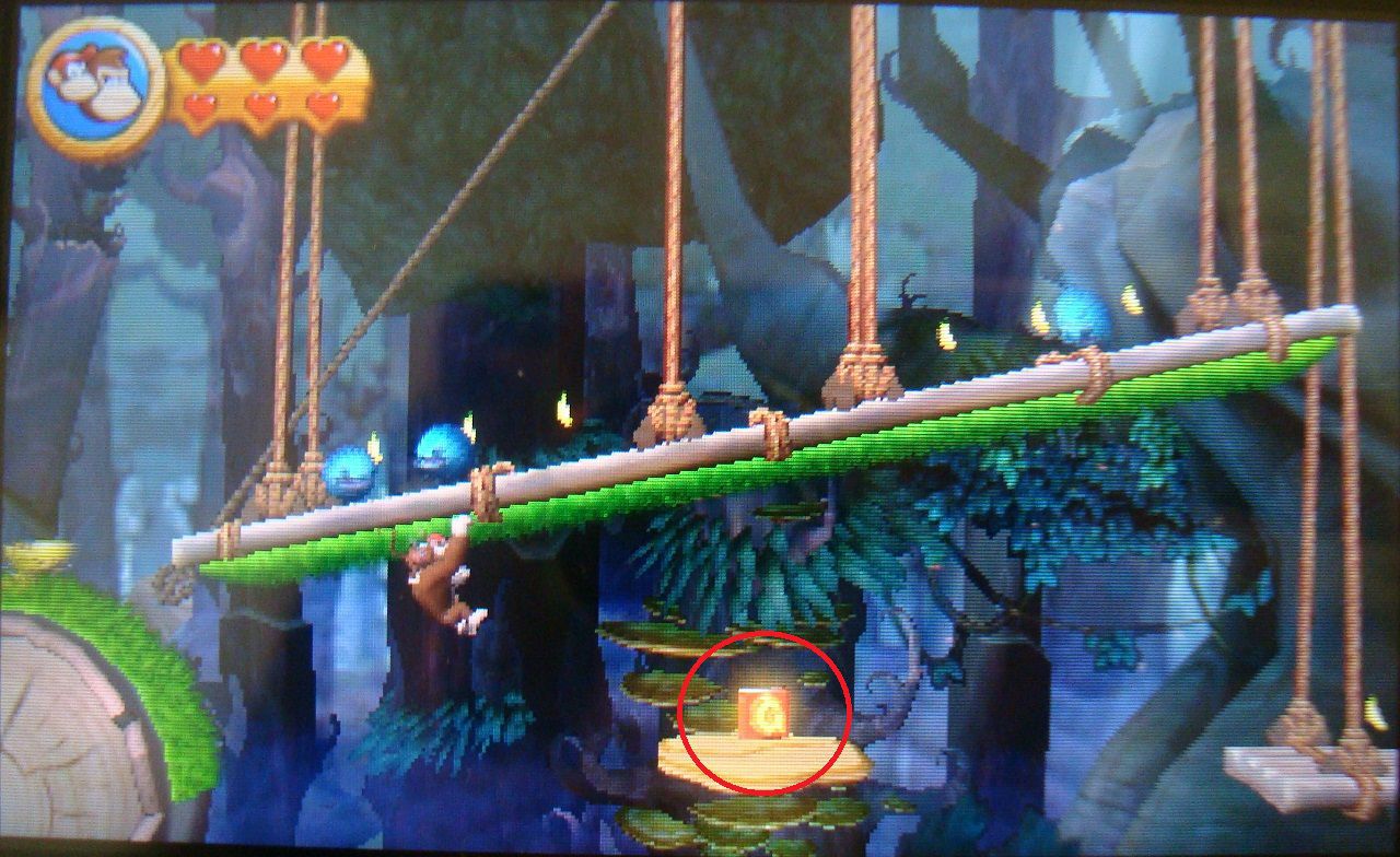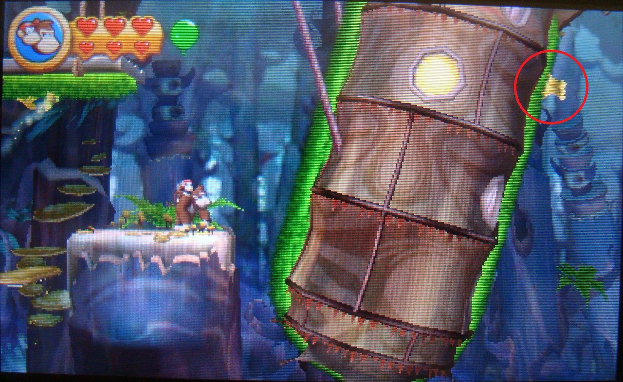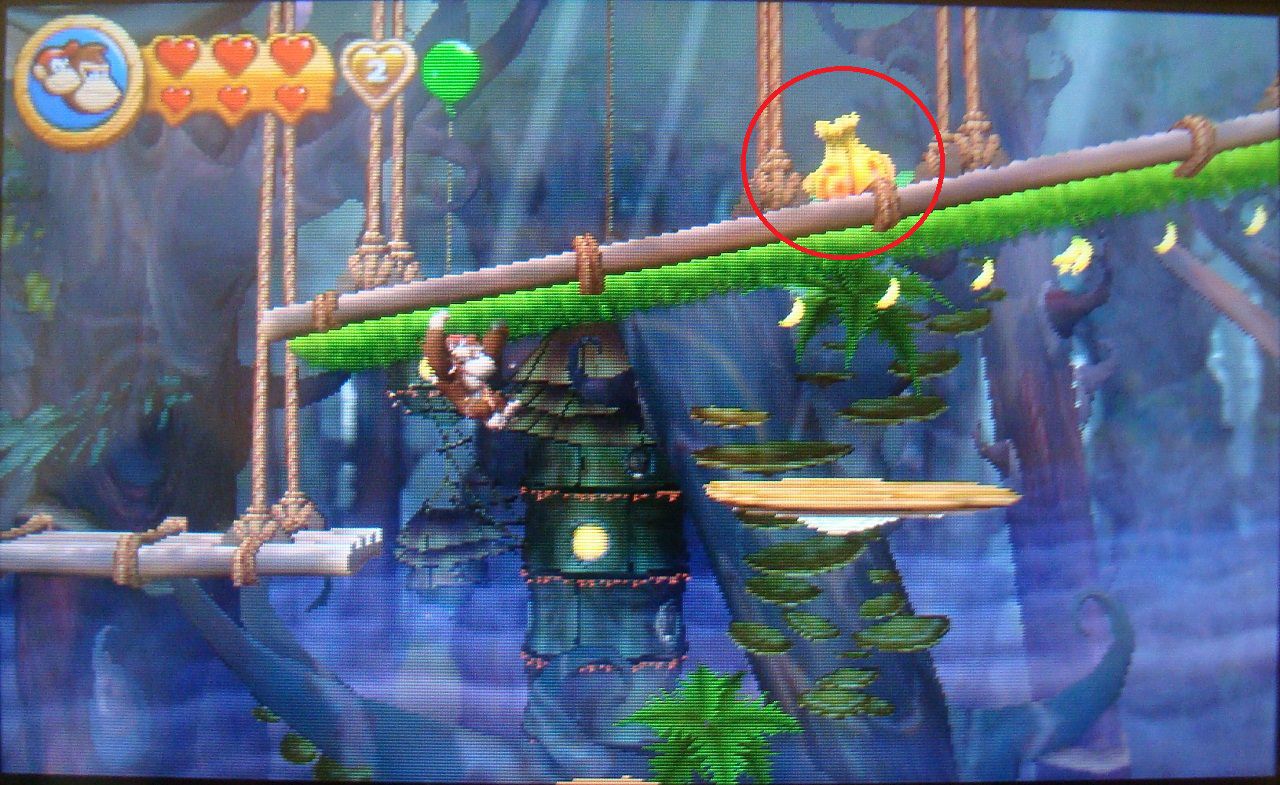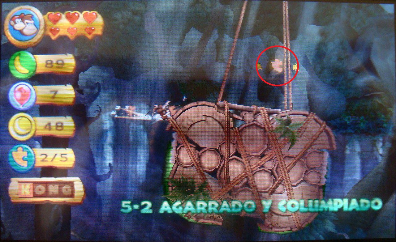 Llegarás al primer cerdo del punto de control. Engánchate a la hierba de la siguiente plataforma y cruza hasta el otro lado. Ahí, rebota en un murciélado para subirte a la plataforma que acabas de dejar atrás. Al lado izquierdo superior tiene un barril que te llevará a una fase bonus. Complétala y tendrás la segunda pieza de puzle.