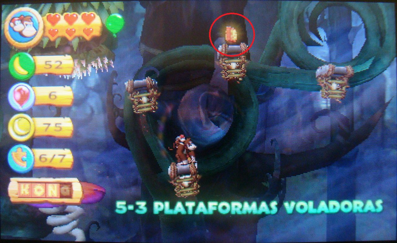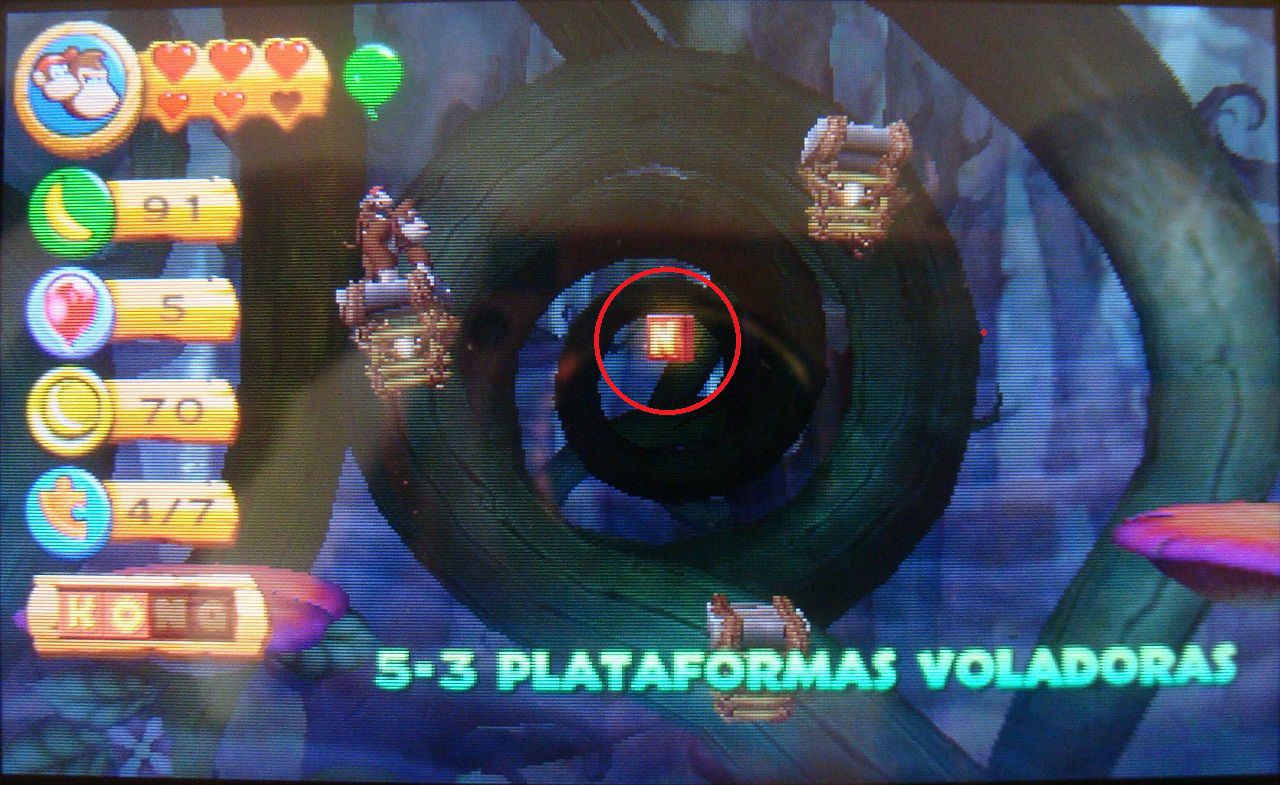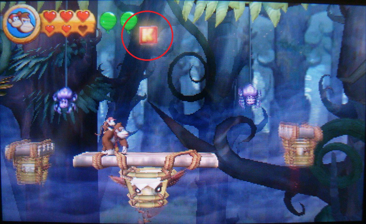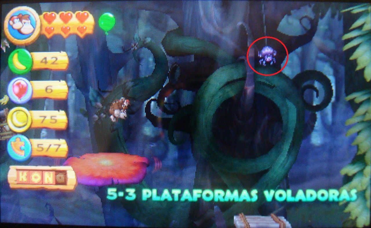 Avanza un poco más y métete en los barriles. Pasa por delante del cerdito, recoge el barril DK y salta sobre una araña en la siguiente plataforma para alcanzar la letra O.
