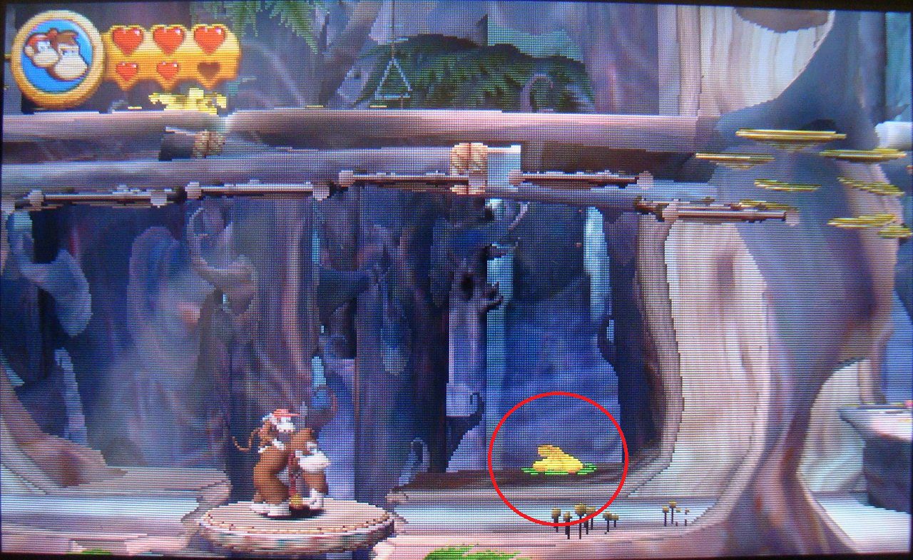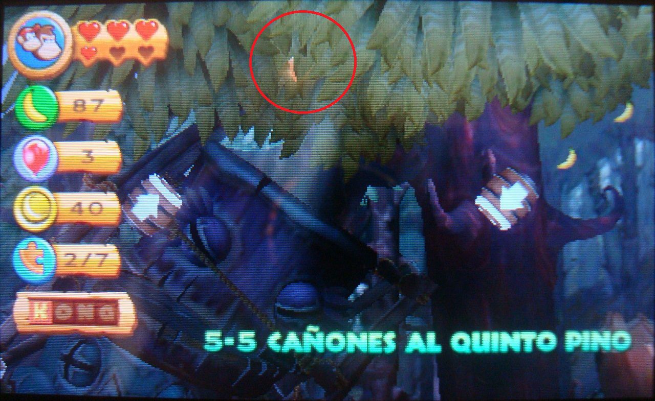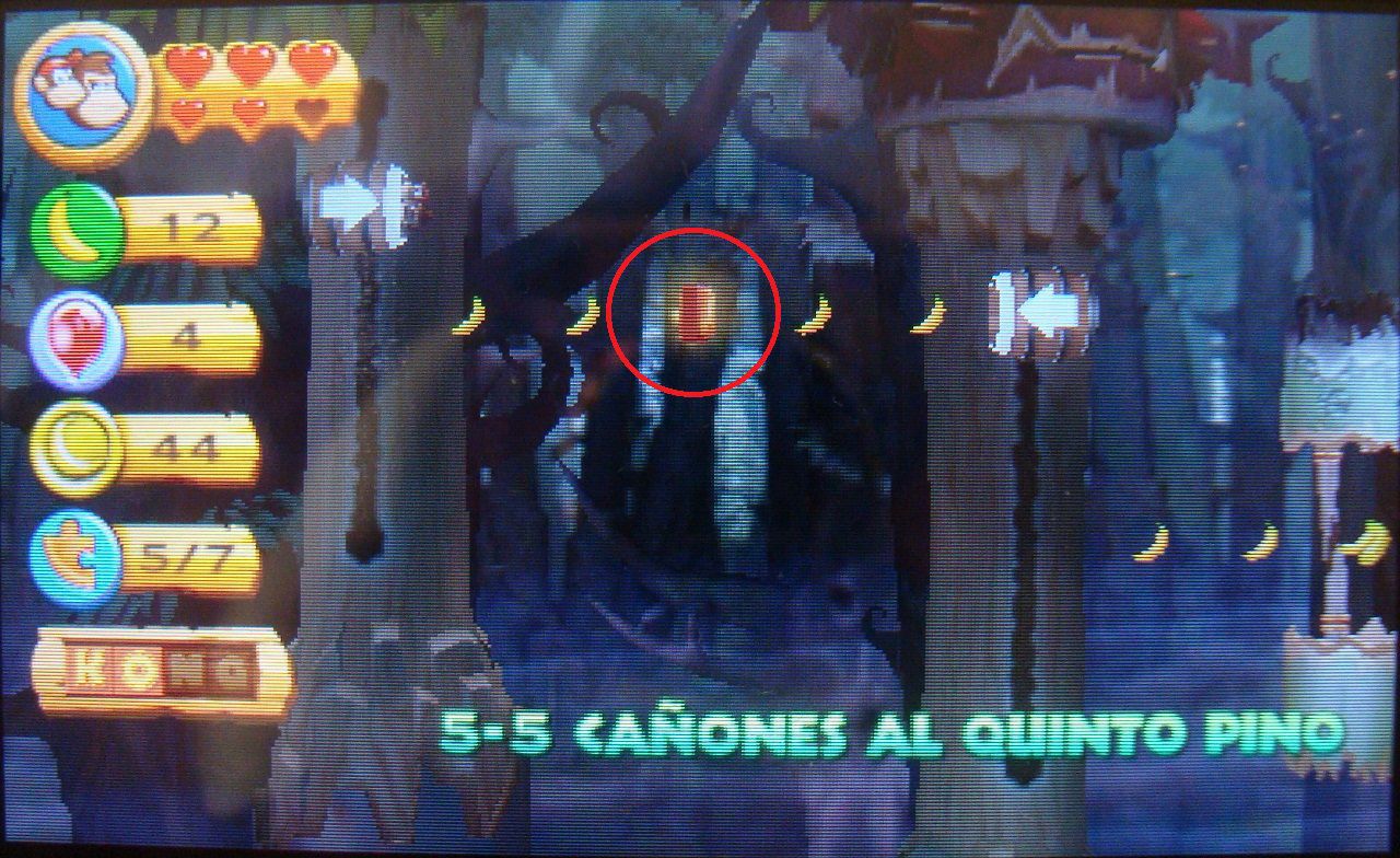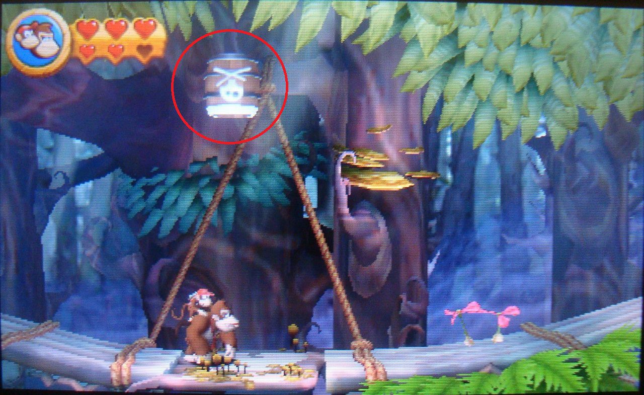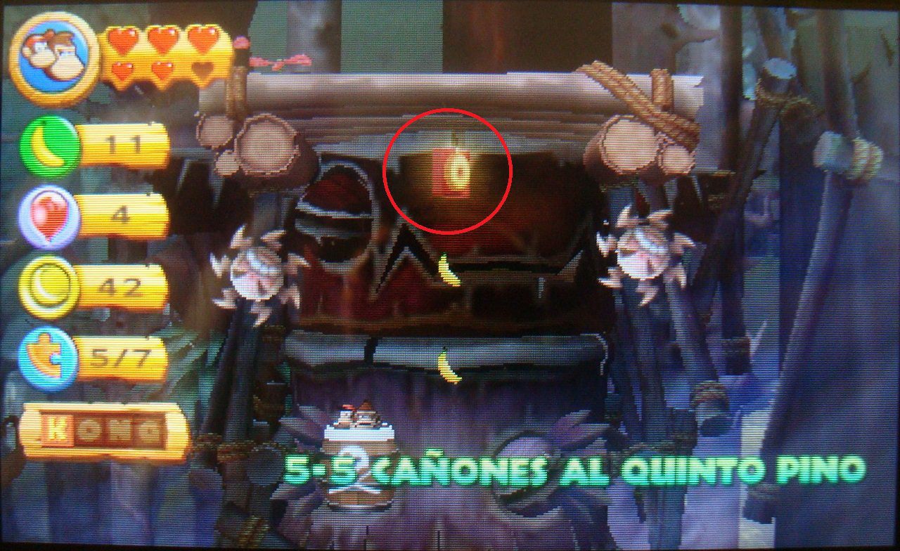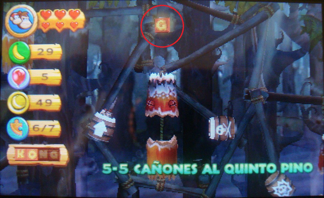 Súbete de nuevo a los barriles y avanza hasta ver la letra G en lo alto de un tótem. Espérate a que el barril en el que estás apunte hacia ella, y entonces dispara.