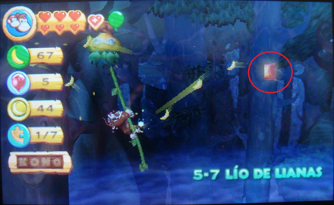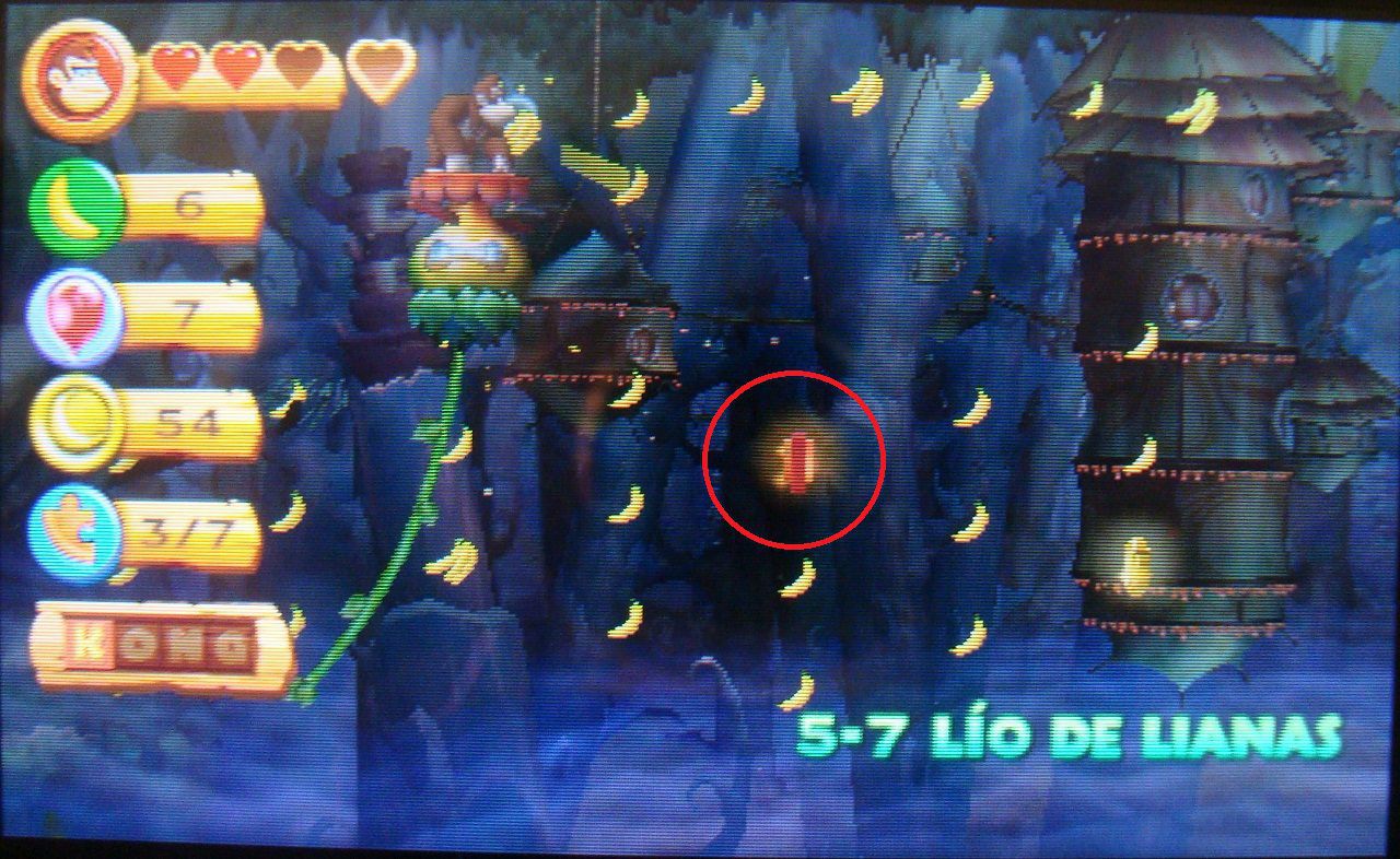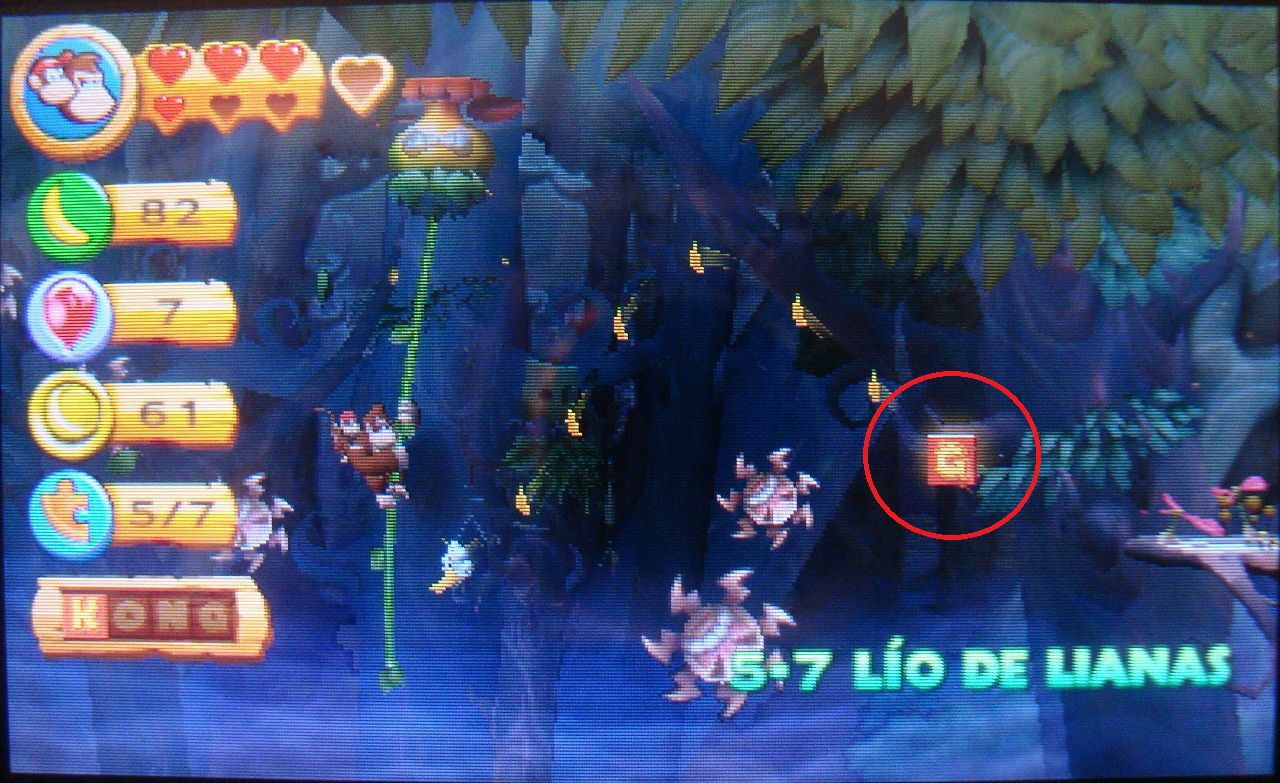 Por tercera vez, cógete a la liana que se desplaza horizontalmente y espera a que aparezca la letra G al final de una ristra de plátanos.