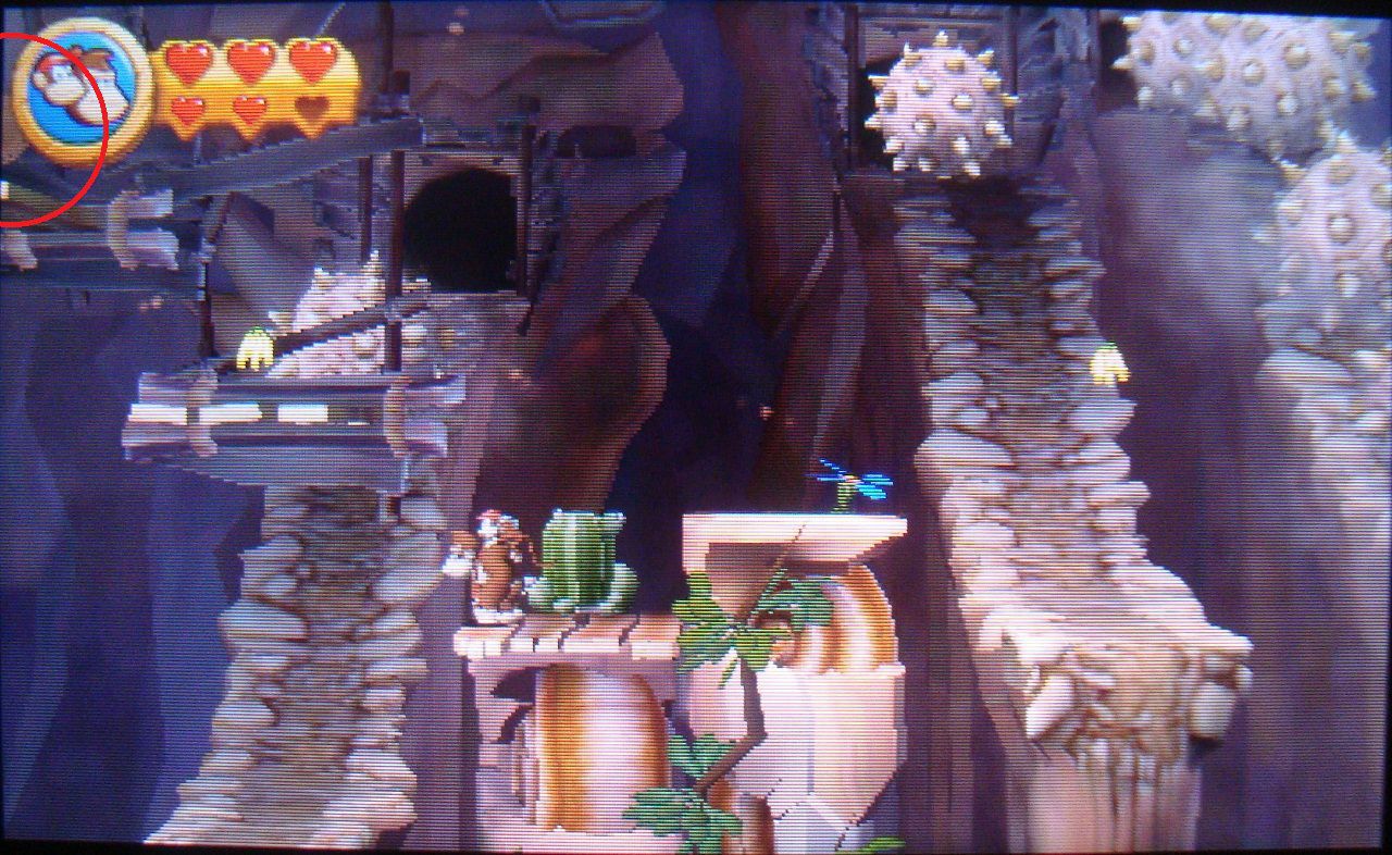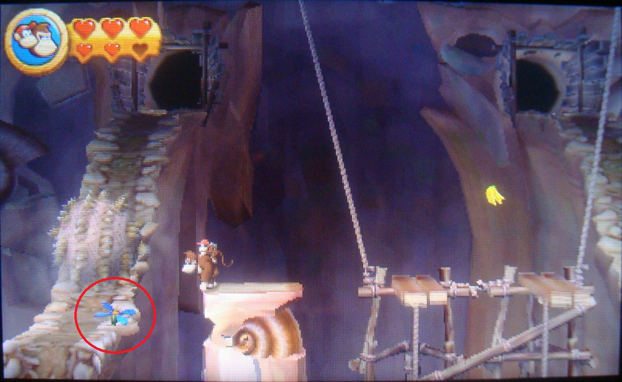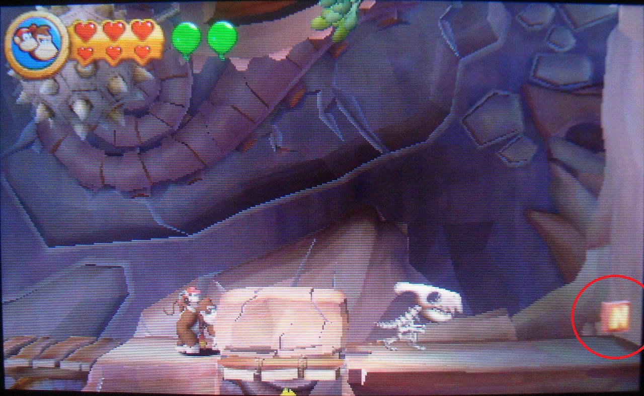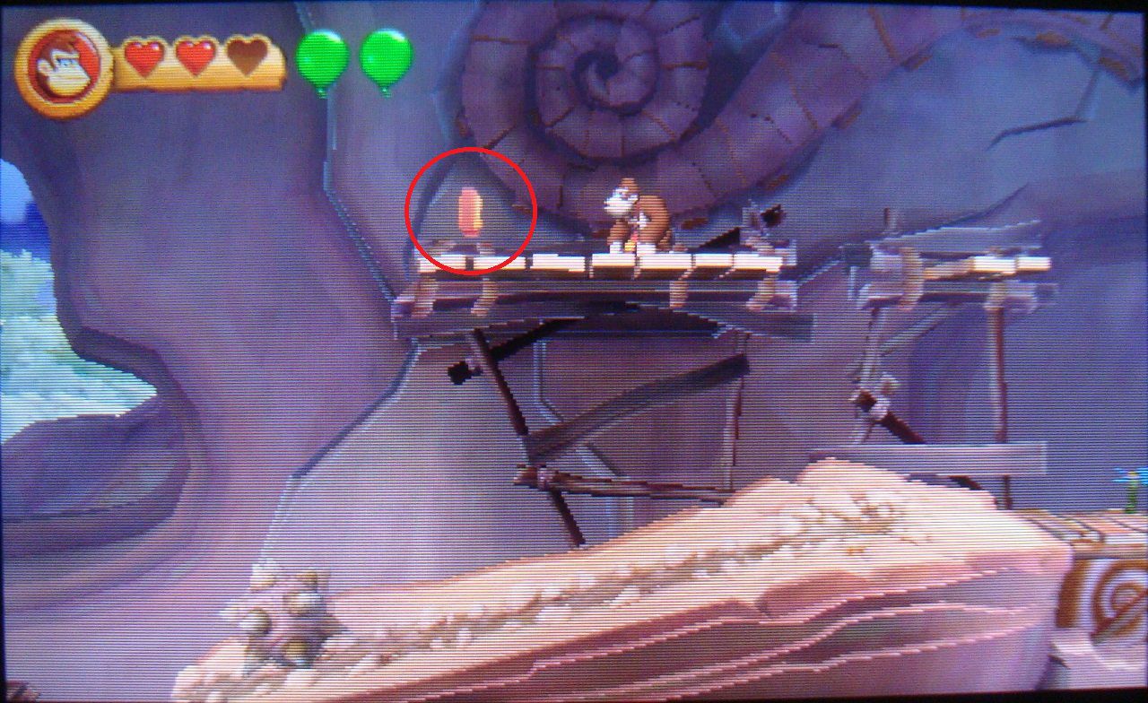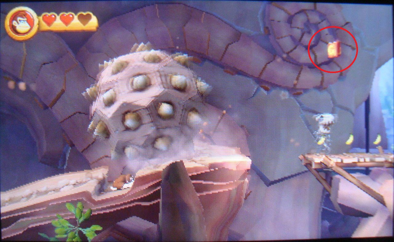 Sopla el molinillo para que baje la plataforma, sube a ella y cuélgate de la liana hasta que salga una plataforma circular. Golpéala repetidas veces y se abrirá el camino. Pasa por donde caen las rocas rodantes y salta sobre el enemigo de la derecha para alcanzar la plataforma de arriba. Ya puedes ir a por la letra K.
