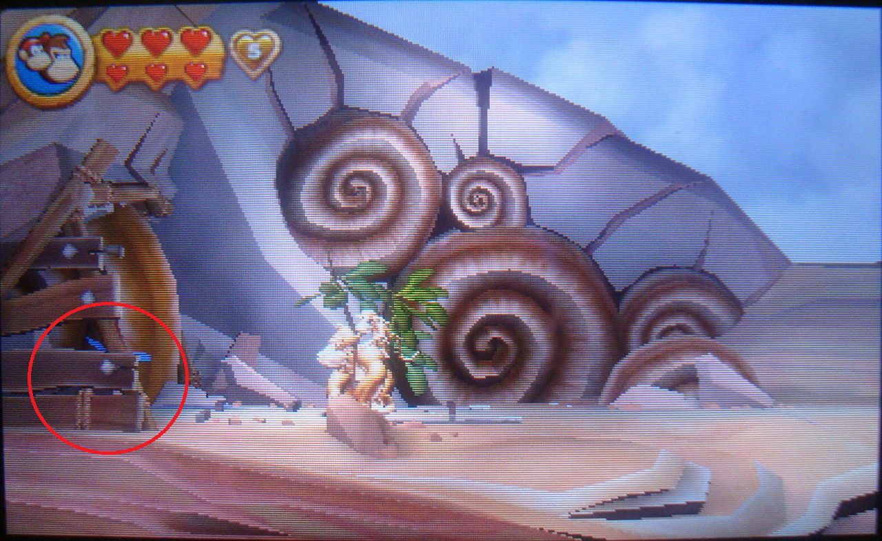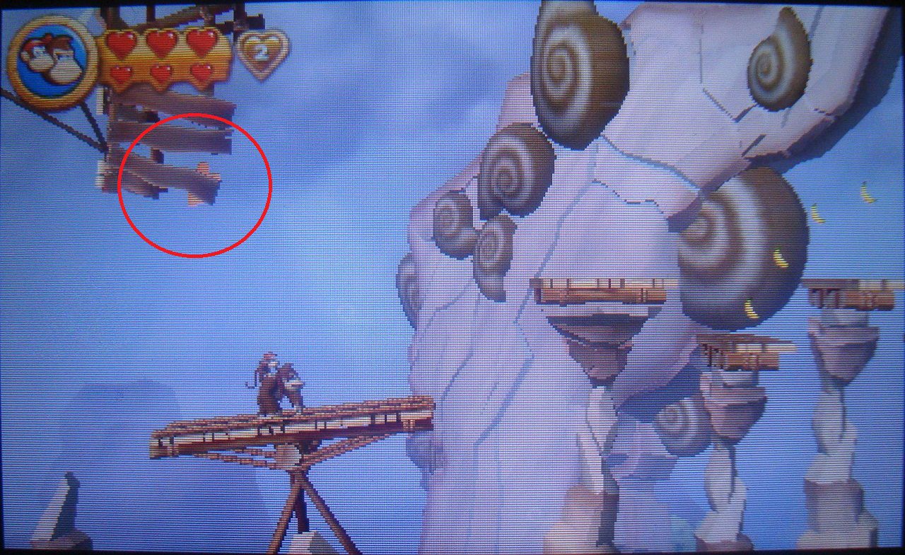 Salta rápidamente para no caerte al vacío. De las siguientes plataformas, algunas se caen y otras simplemente se inclinan hacia el lado en que hagas peso. Después del barril DK, permanece atento para coger la tercera pieza de puzle, oculta tras una estructura de madera.