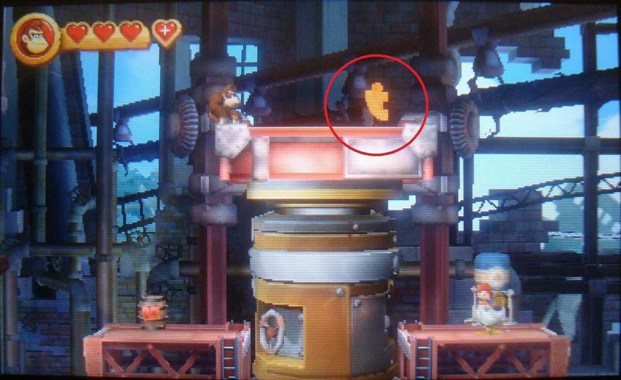 Ahora viene una gran prensa amarilla, en la que tienes que ir escondiéndote en los huecos para avanzar. Entre el primer y el segundo hay una parte de suelo agrietado, que puedes acabar de romper para acceder a una fase bonus. Cogiendo todos los ítems obtendrás la cuarta pieza de puzle.