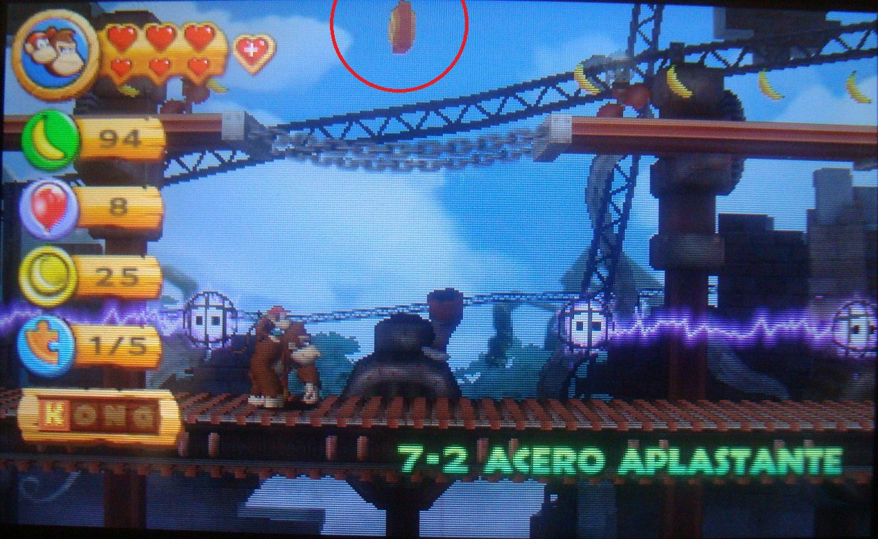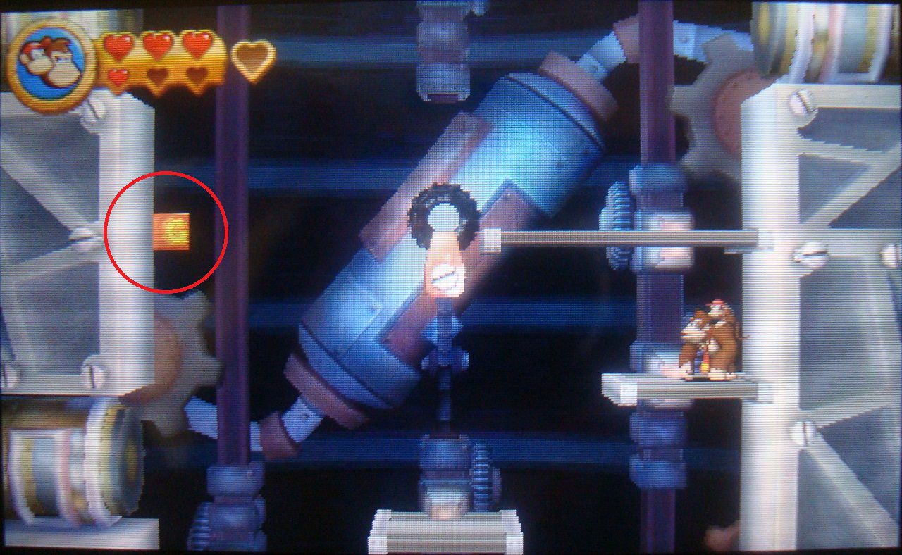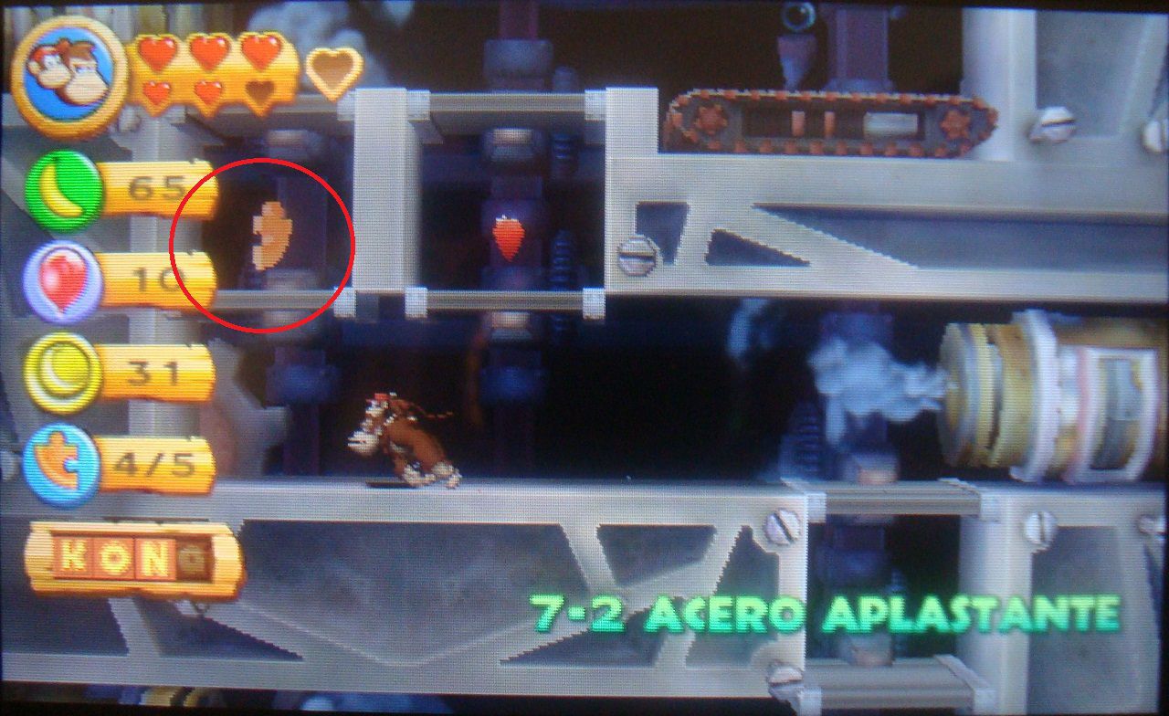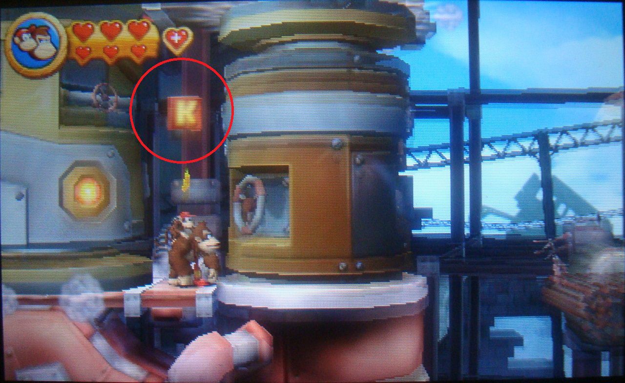 Avanza normal hasta ver el barril DK en la plataforma siguiente. En lugar de saltar hacia abajo, realiza un salto de larga distancia hacia la parte superior, donde está la primera pieza de puzle.