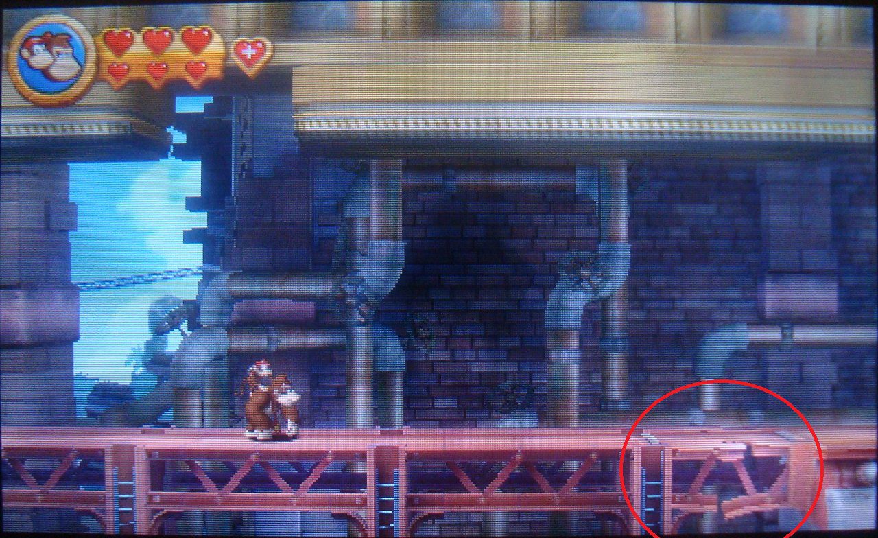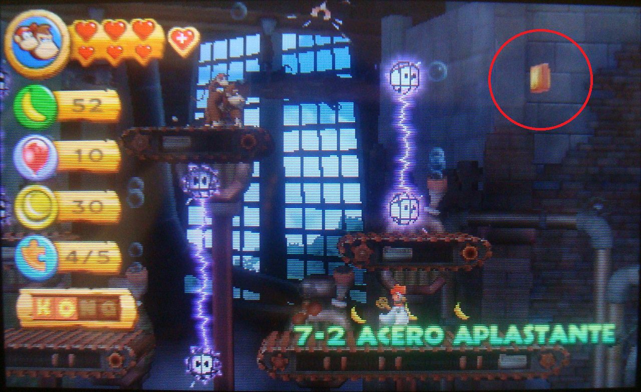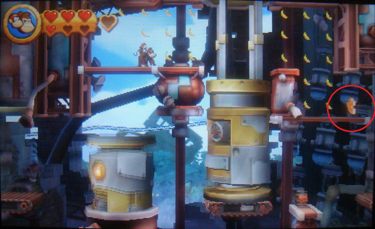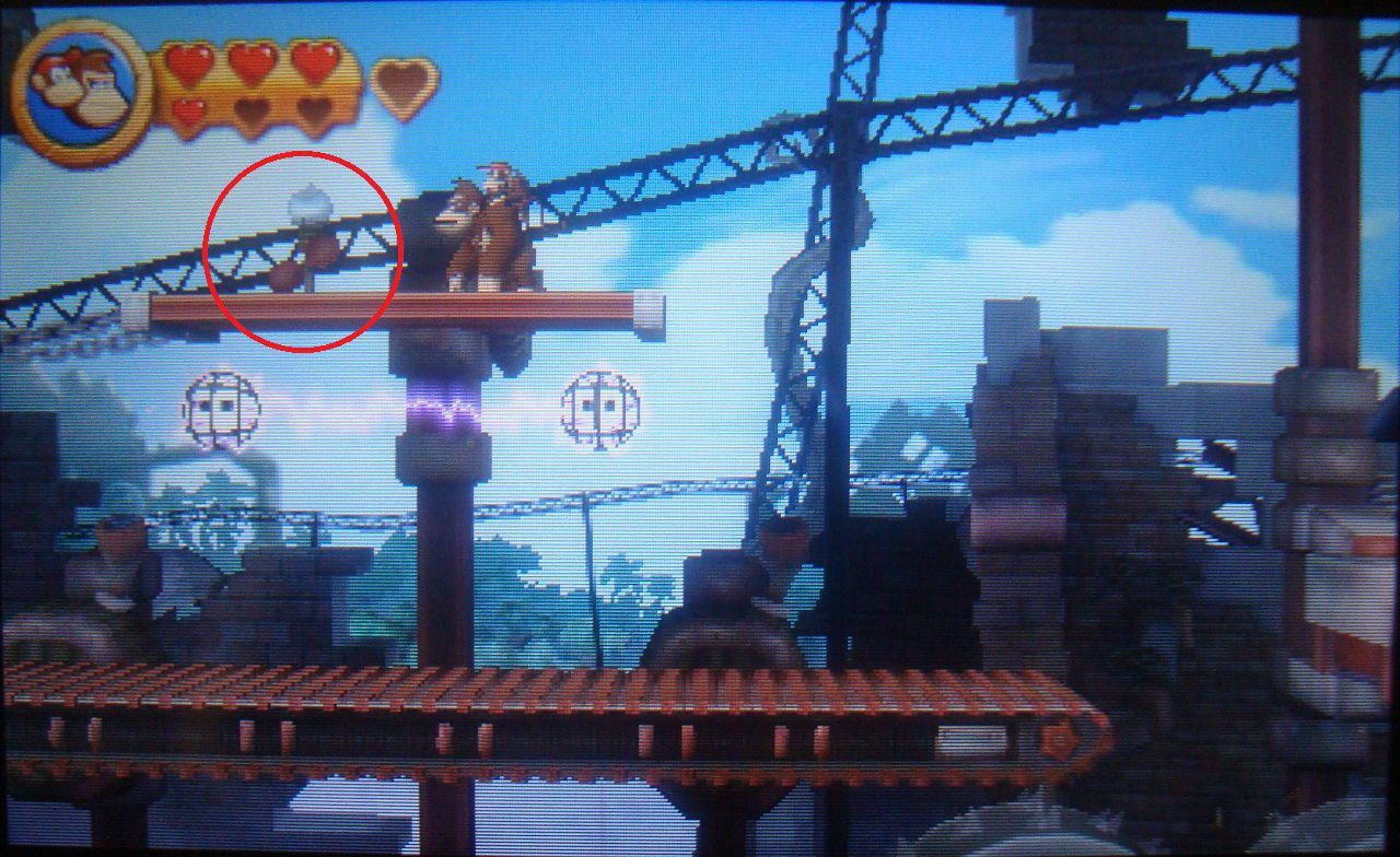 Avanza normal hasta ver el barril DK en la plataforma siguiente. En lugar de saltar hacia abajo, realiza un salto de larga distancia hacia la parte superior, donde está la primera pieza de puzle.