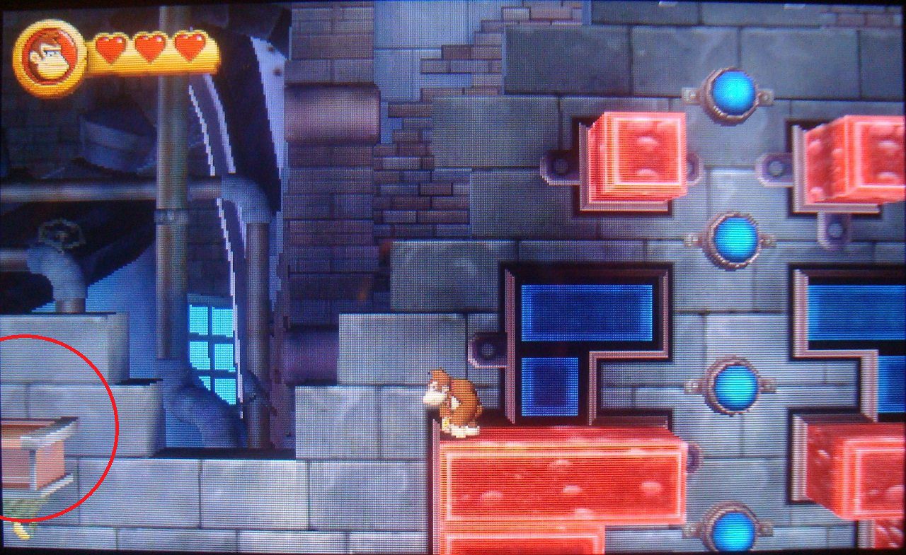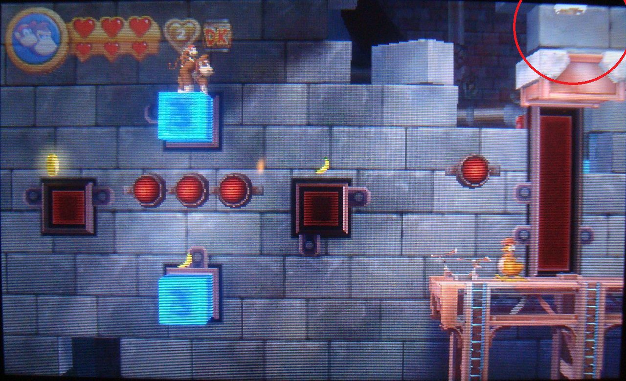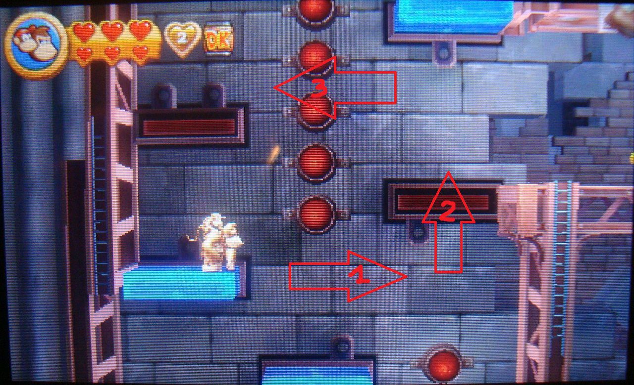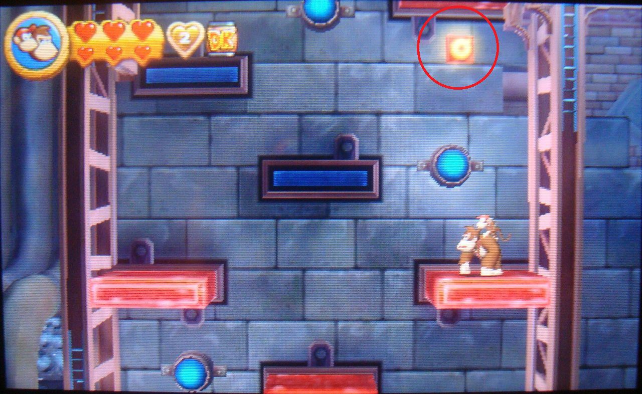 En este nivel hay interruptores de colores rojo y azul que cambian la posición de los bloques de dicho color. Avanza con normalidad hasta que tengas que subirte a un bloque azul. Desde encima, haz un salto de larga distancia hacia el pasillo que hay en la pared izquierda. Al fondo encontrarás un barril que te lleva a una fase bonus, cuyo premio es la primera pieza de puzle.