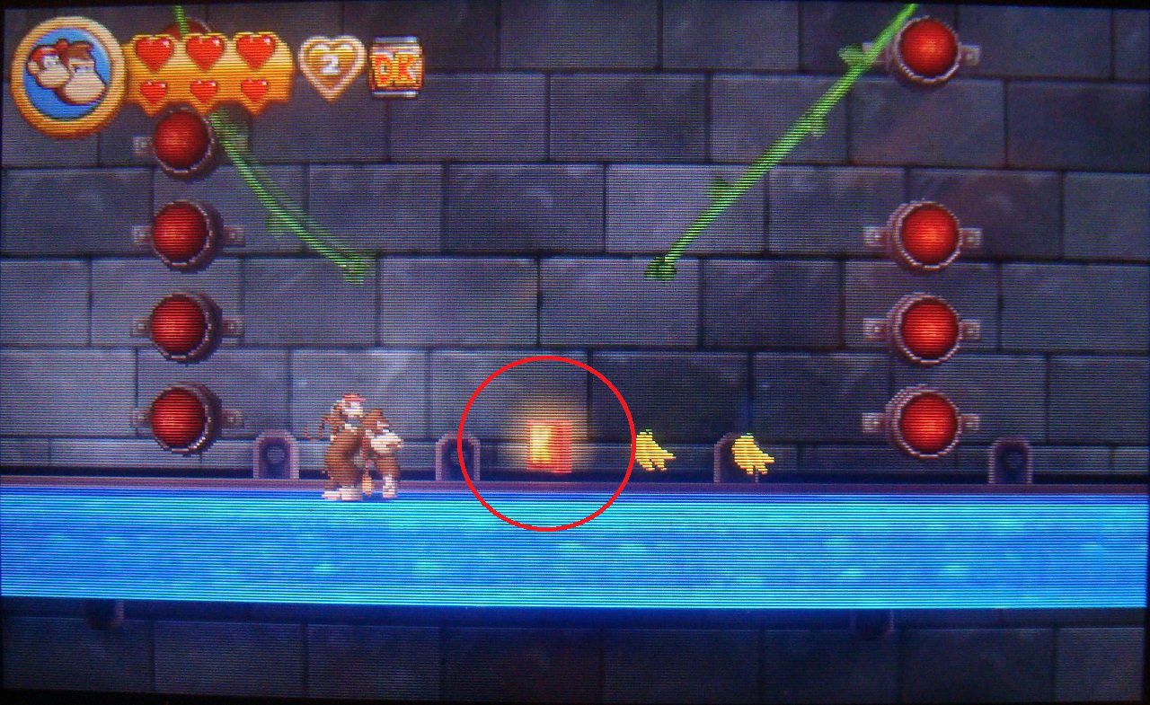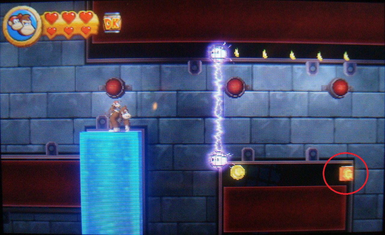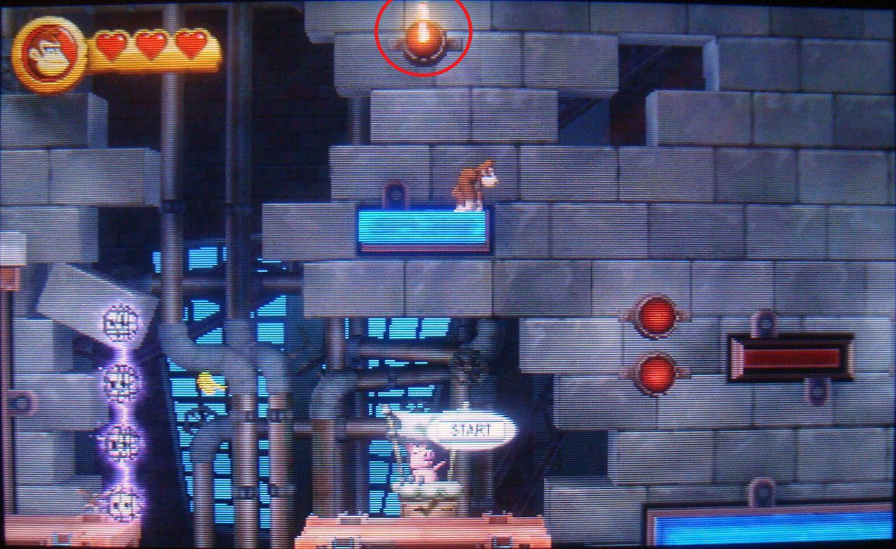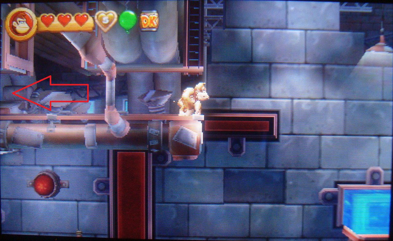 En este nivel hay interruptores de colores rojo y azul que cambian la posición de los bloques de dicho color. Avanza con normalidad hasta que tengas que subirte a un bloque azul. Desde encima, haz un salto de larga distancia hacia el pasillo que hay en la pared izquierda. Al fondo encontrarás un barril que te lleva a una fase bonus, cuyo premio es la primera pieza de puzle.