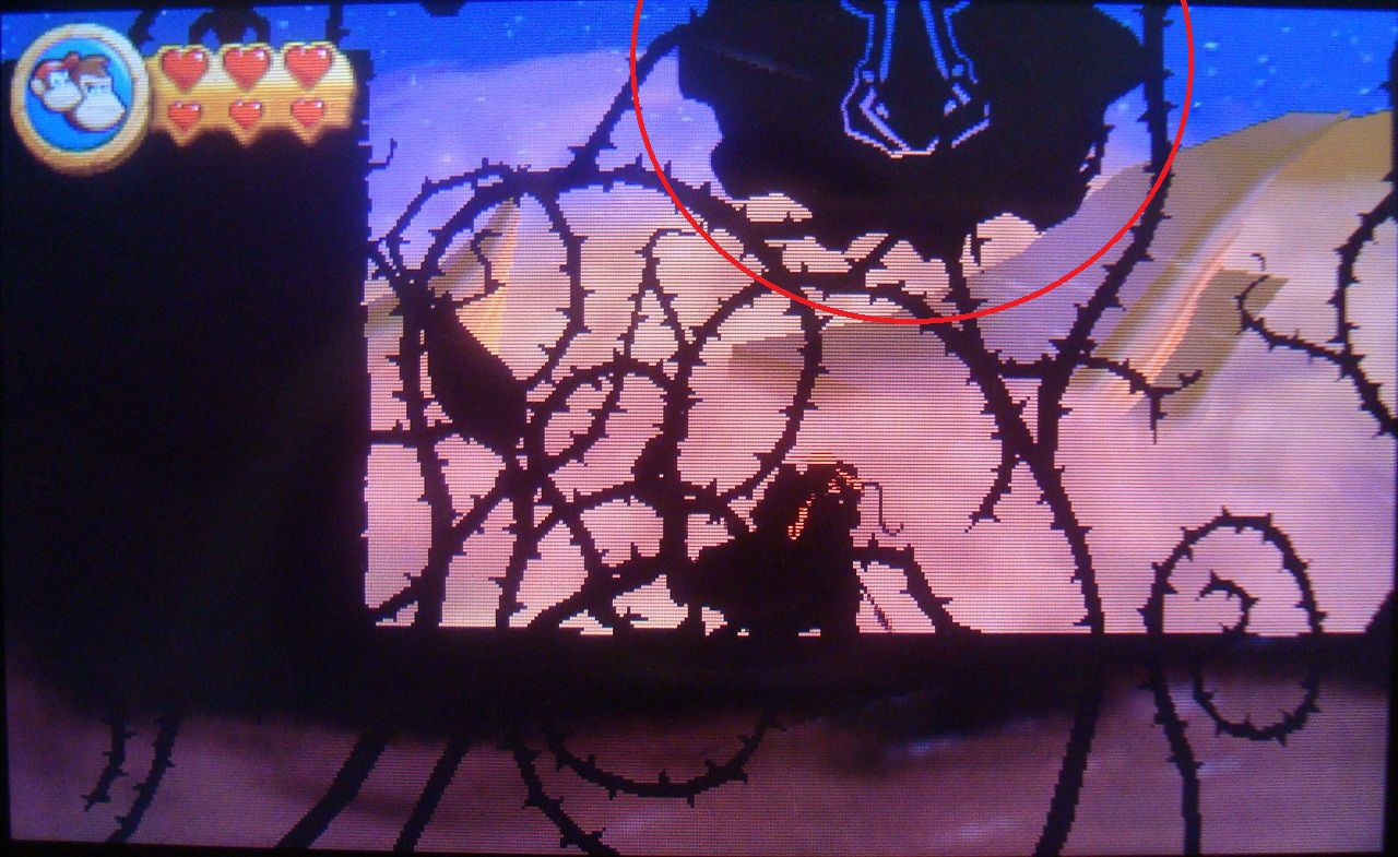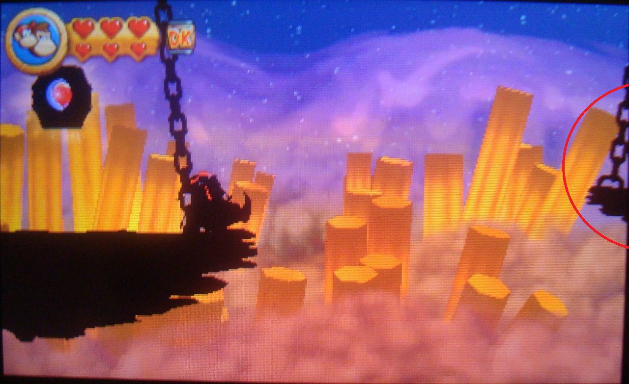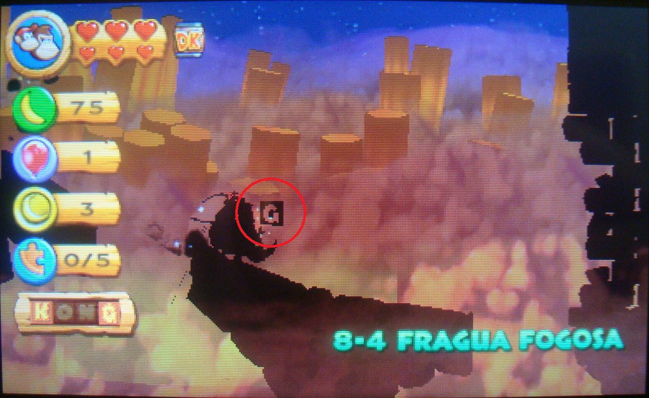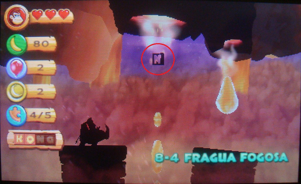 Avanza hasta localizar una bola que no está oculta por las sombras. En la plataforma que está justo debajo de esa bola baja de Rambi pulsando L. Luego salta para coger la letra K.