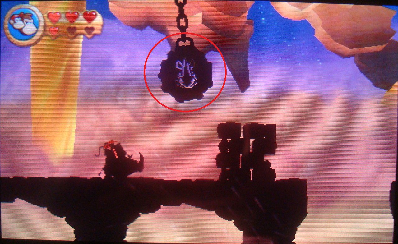 Atento a la siguiente bola colgante con cara de Rambi que encuentres en tu camino. Rómpela, pero sin tocar el bloque de piedra de la derecha. Entonces baja con L y encarámate a este bloque para alcanzar la cuarta pieza de puzle, sobre una plataforma que acaba de descender.