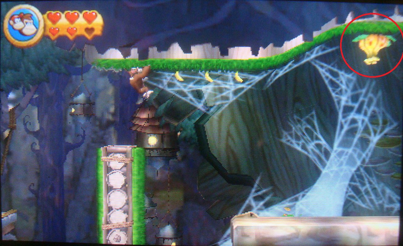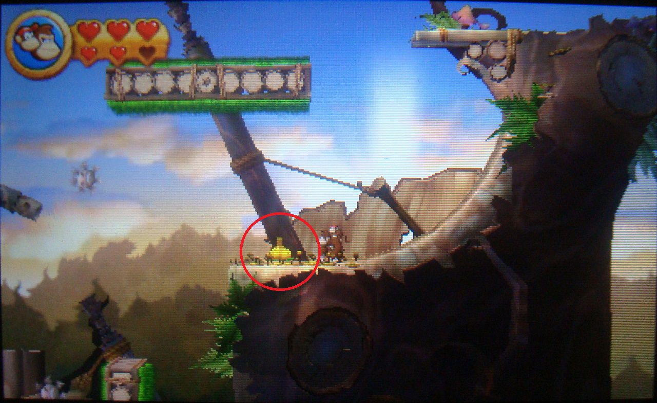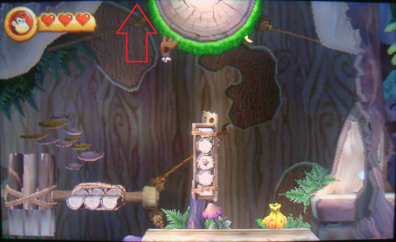 Avanza con normalidad hasta dar con unas plataformas que se mueven en distintas direcciones. Salta sobre la tercera cuando esté en vertical y cógete al techo con hierba de arriba. Trepa y en lo alto encontrarás un barril que te lleva a una fase bonus. Coge todos los plátanos, las monedas y el globo para obtener la primera pieza de puzle.