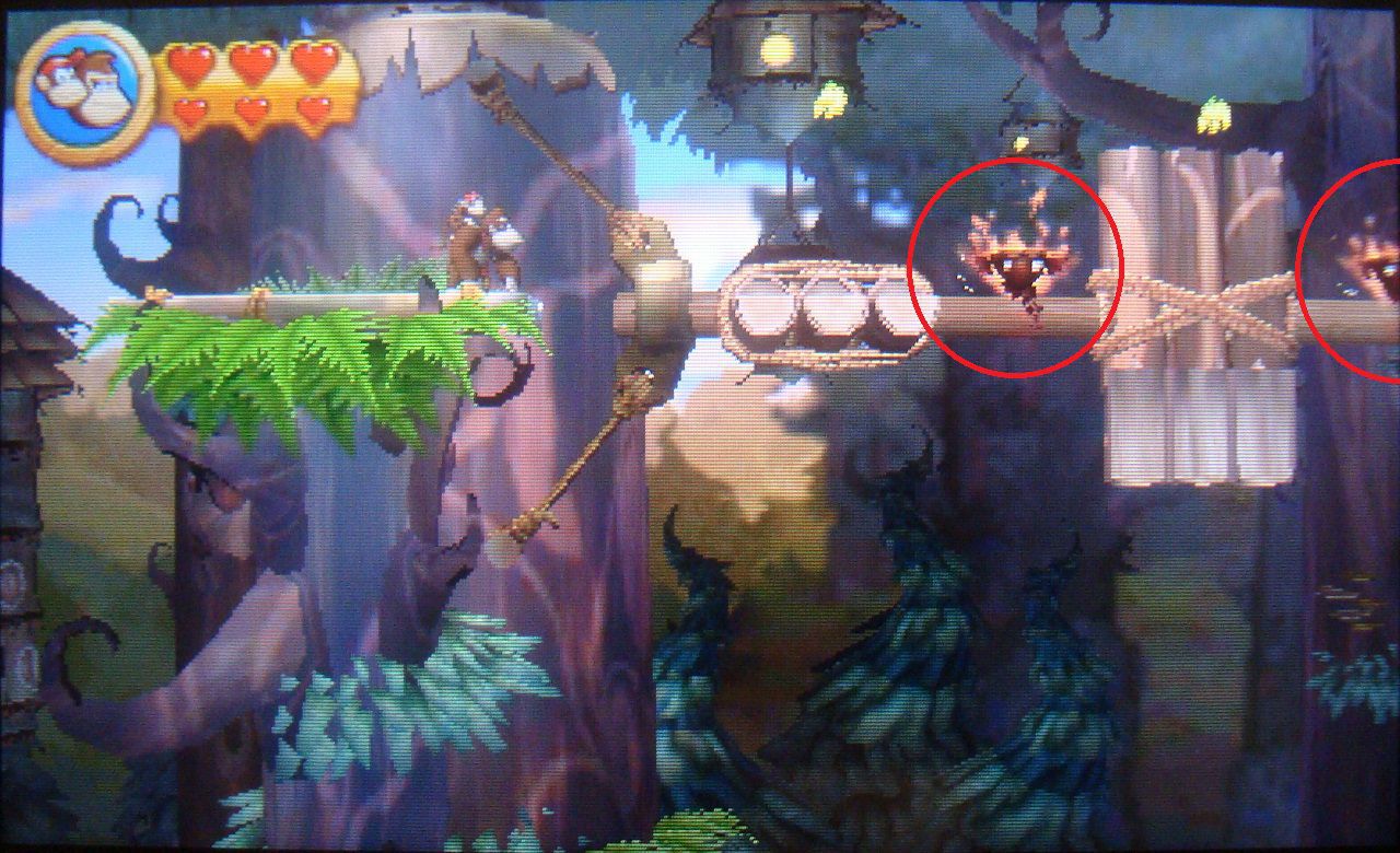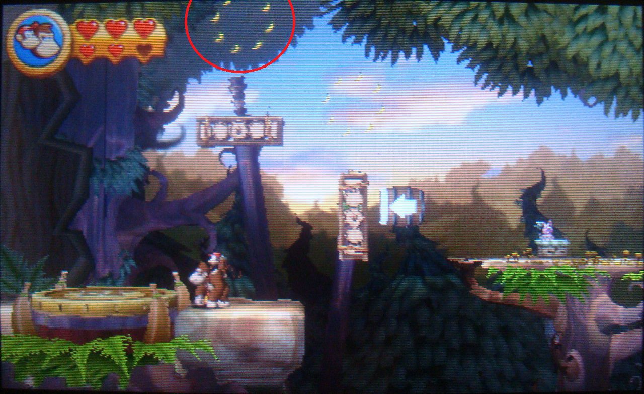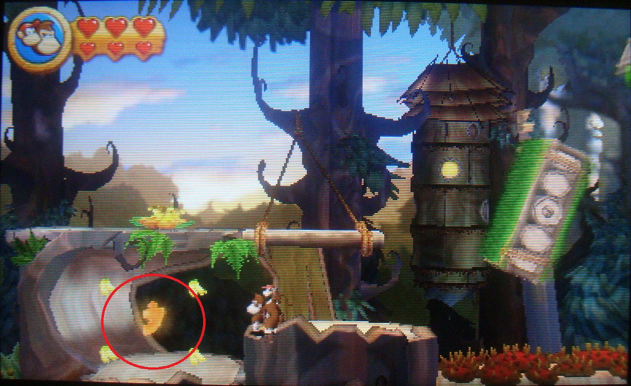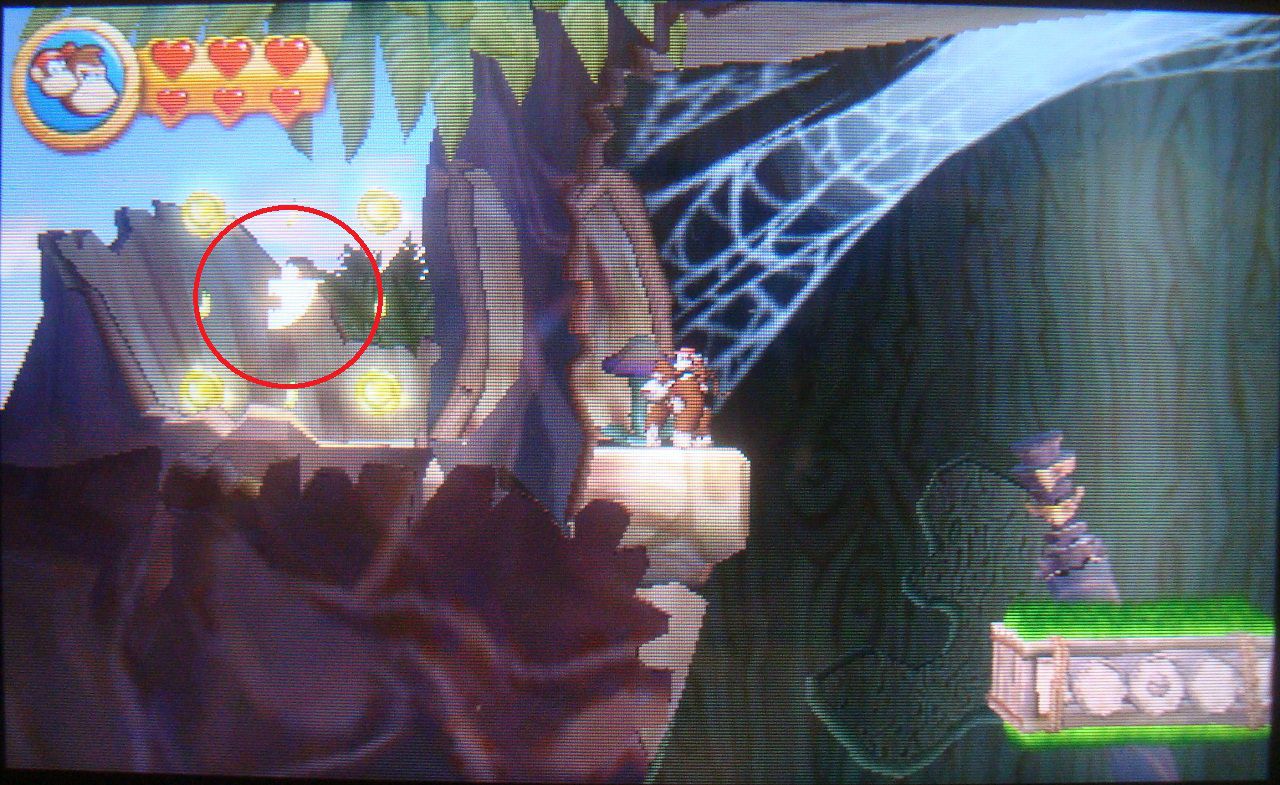Avanza con normalidad hasta dar con unas plataformas que se mueven en distintas direcciones. Salta sobre la tercera cuando esté en vertical y cógete al techo con hierba de arriba. Trepa y en lo alto encontrarás un barril que te lleva a una fase bonus. Coge todos los plátanos, las monedas y el globo para obtener la primera pieza de puzle.