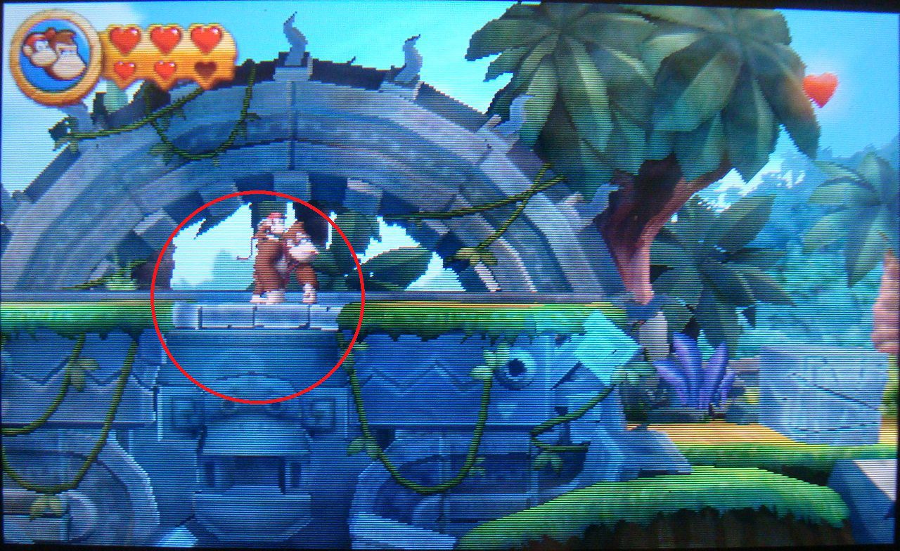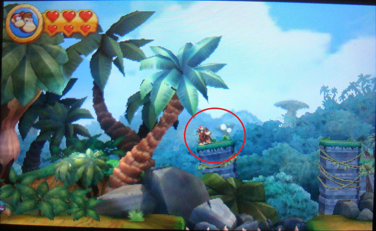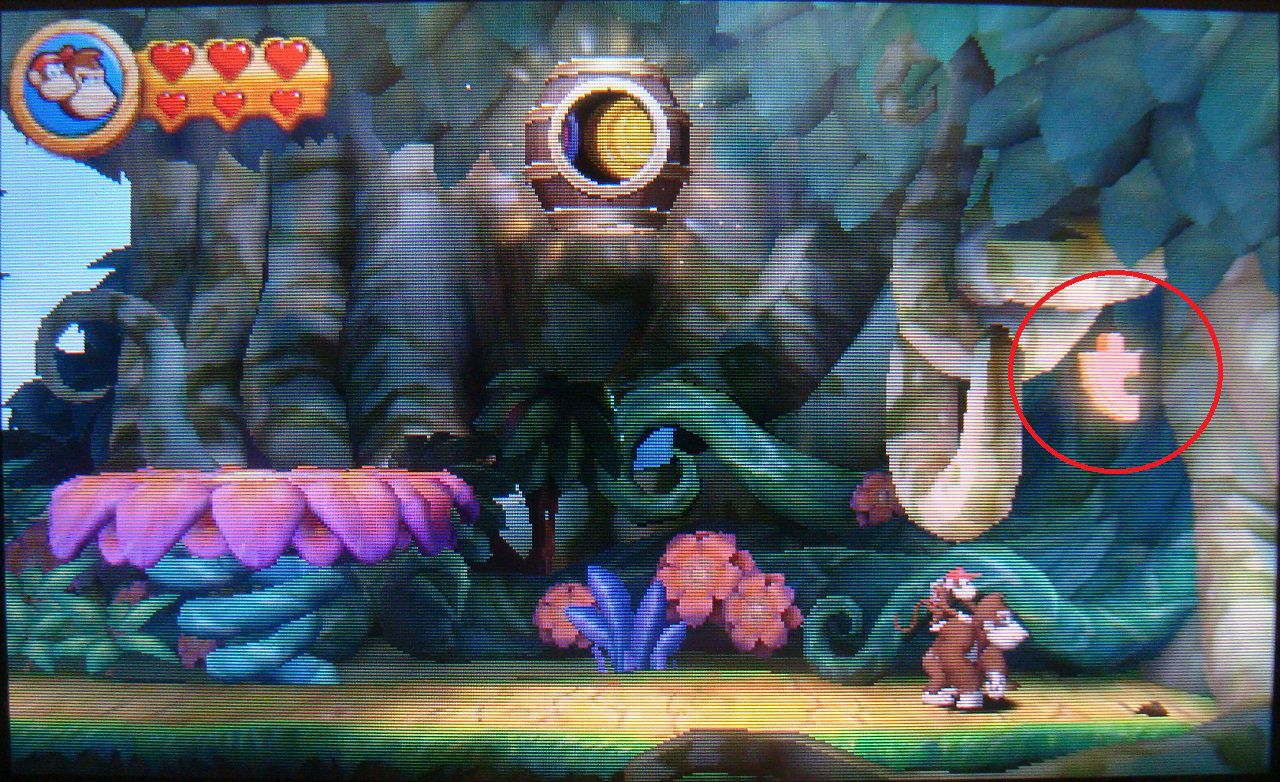 A continuación pasarás por delante de un cerdito: es un punto de control. Al llegar a la plataforma circular, golpéala hasta hundirla y cambiará el escenario. Métete en el barril que acaba de aparecer y pulsa A para salir disparado al fondo de la pantalla. Salta hacia la izquierda y sopla la flor para conseguir la sexta pieza de puzle.