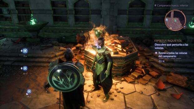 En otras celdas verás palancas (que también debes activar) y en otra un cristal rojo que te permite romper la barrera de la celda de al lado hasta el cofre con una trampa de necrosis y la armadura Molde de hierro. En otra de las celdas hay un documento y dos braseros que, cuando los enciendas, harán aparecer un elemento con el que puedes interactuar. Se trata de un foco de maldad que Emmrich puede aplacar para hacer aparecer una voluta.