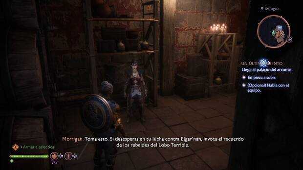 Tras la secuencia puedes hablar con tus compañeros, comprar objetos a Isabella y mejorar tu equipo con la Guardia. Cuando avances al marcador, te encontrarás con Morrigan nada más abrir la puerta. Habla con ella para recibir la runa de Felassan, que si se usa contra Elgar'nan te proporcionará un buff general enorme, dadas las circunstancias.