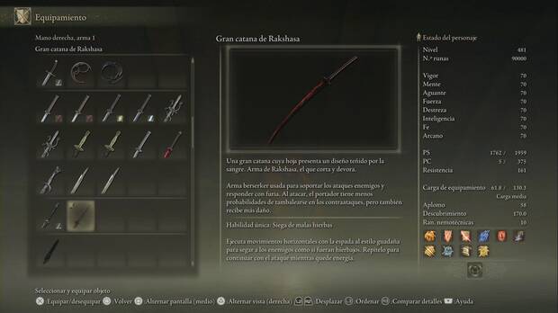 Entre las muchas armas que podemos conseguir en Elden Ring: Shadow of the Erdtree nos encontramos con las catanas grandes. Se trata de katanas más grandes (daitōs). Ofrece las ventajas de las katanas y sus efectos de hemorragia con la potencia de impacto del espadón, aunque hay que tener en cuenta que no tiene todo el potencial de ninguna de las dos cosas.