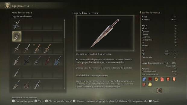 Por su parte, la Daga de letra herrérica, la única arma que realmente encaja en la categoría de hojas arrojadizas, permite ser empuñada a dos manos para un combo rápido lanzando dagas con ambas manos. Veloces y letales si aplicas un buen efecto extra con Cenizas de guerra.