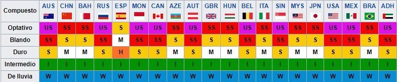 La actual Formula 1 da una importancia capital al tipo de compuesto que utilicemos en cada momento. Debido a la nueva reglamentación tendremos disponibles una serie de compuestos para cada sesión, por lo que dependerá de nosotros utilizar un tipo de goma u otra según las limitaciones que tengamos. Además, según el tipo de circuito la FIA (Federación Internacional de Automovilismo) nos ofrecerá tres tipos de compuestos, además de las gomas de lluvia en caso de que la meteorología lo requiera.