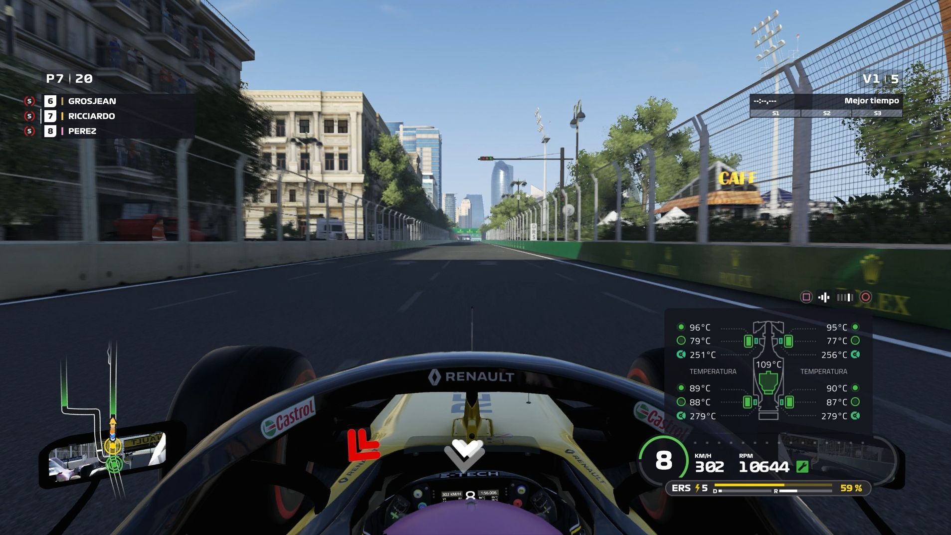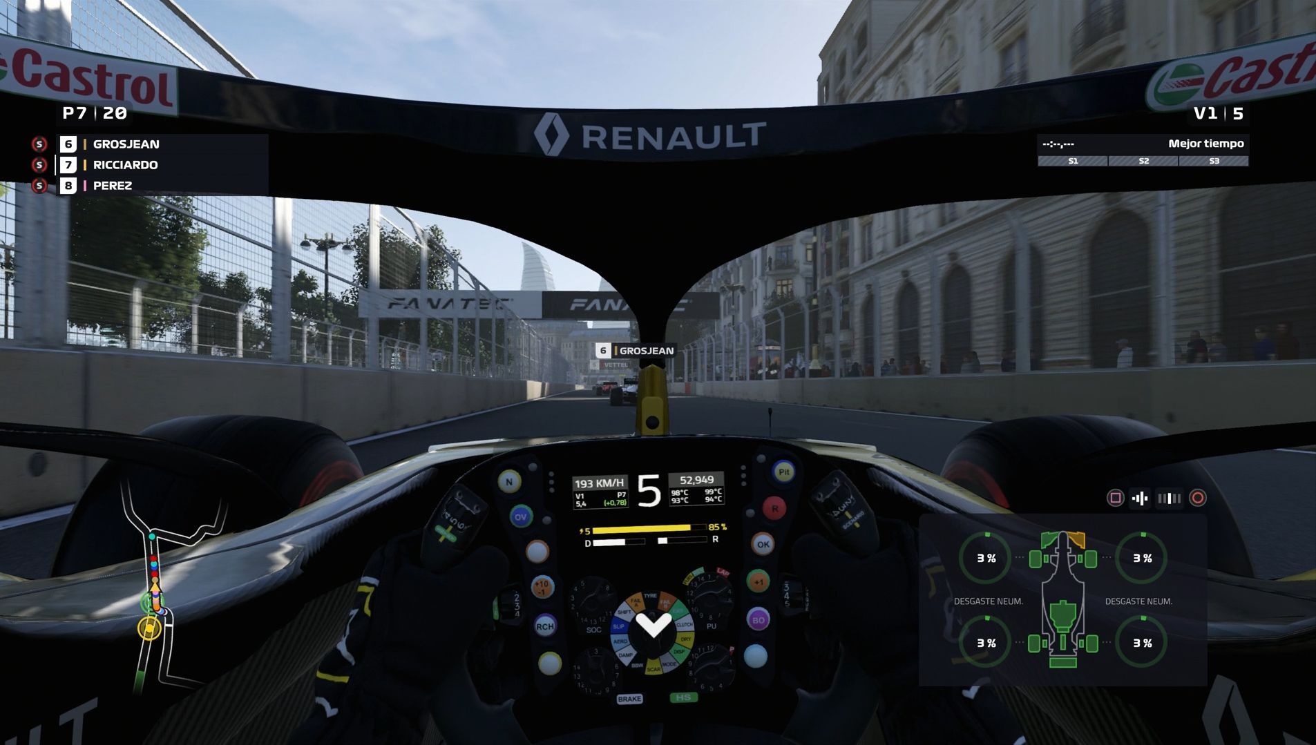 Sin embargo, el trabajo no termina aquí, durante la carrera también podemos ajustar elementos como distribución de frenada, ERS o gasolina, elementos muy importantes que nos pueden dar un salto de calidad. Para ello es imprescindible estar muy concentrados y tener mucho cuidado al configurarlo, ya que pilotamos a altas velocidades y cualquier despiste puede ser fatal. En este sentido, recomendamos las largas rectas de meta o contrameta para ajustar el coche de cara a la siguiente vuelta y, solo en casos de extrema necesidad, accionar botones de configuración en zonas con muchas curvas.