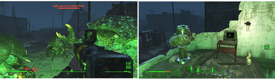 Según salimos cuidado, pueden atacarnos hasta 3 Mirelurks Resplandecientes y son duros, muy cerca de la derecha tenemos la primer torreta, subiendo por unas escaleras, veremos un terminal para activarla, también al lado tenemos un Fat Man y en el piso de abajo una caja fuerte [Maestro].