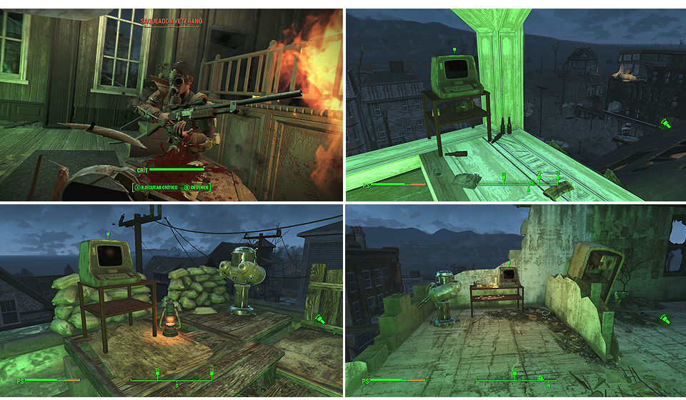 También vemos una iglesia, subiendo hasta el campanario veremos otro terminal para activar las torretas, cuidado que al entrar hay un Saqueador Veterano. En el callejón justo enfrente de la entrada a la iglesia encontraremos el tercer terminal y en un edificio derruido por la parte trasera de la iglesia, encontraremos otros dos terminales en la parte de arriba para completar el objetivo, mucho cuidado que aquí también hay Mirelurks Resplandecientes.