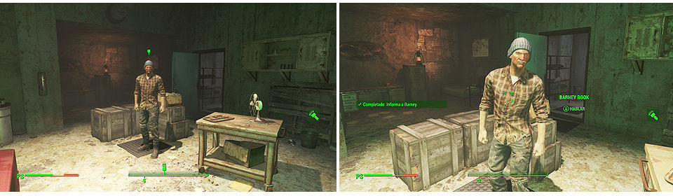 Tras hablar con Barney nos dice que nos reunamos con él en el búnker, por la derecha podemos entrar hasta la casa en ruinas y acceder a la entrada del búnker en el suelo, dentro tendremos una charla con Barney un tipo excéntrico miembro de la patrulla de voluntarios de Salem.